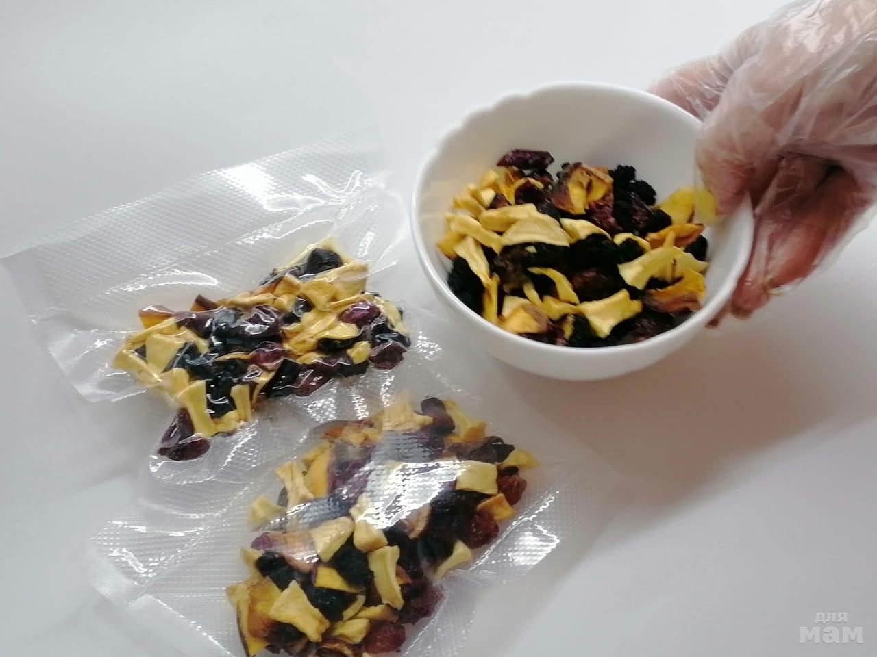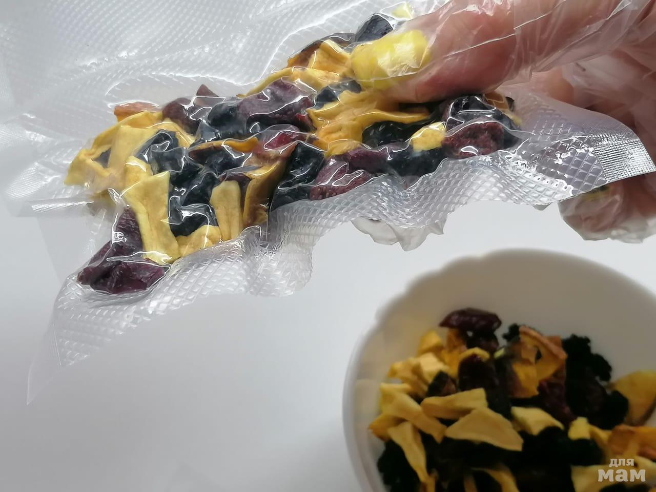 2) А можно также воспользоваться пайкой, но оставить воздух внутри. Минусы - при перепаде температур возможно образование внутри конденсата, что крайне нежелательно для любых сухофруктов. Плюсы - смесь всегда красивая и рассыпчатая.