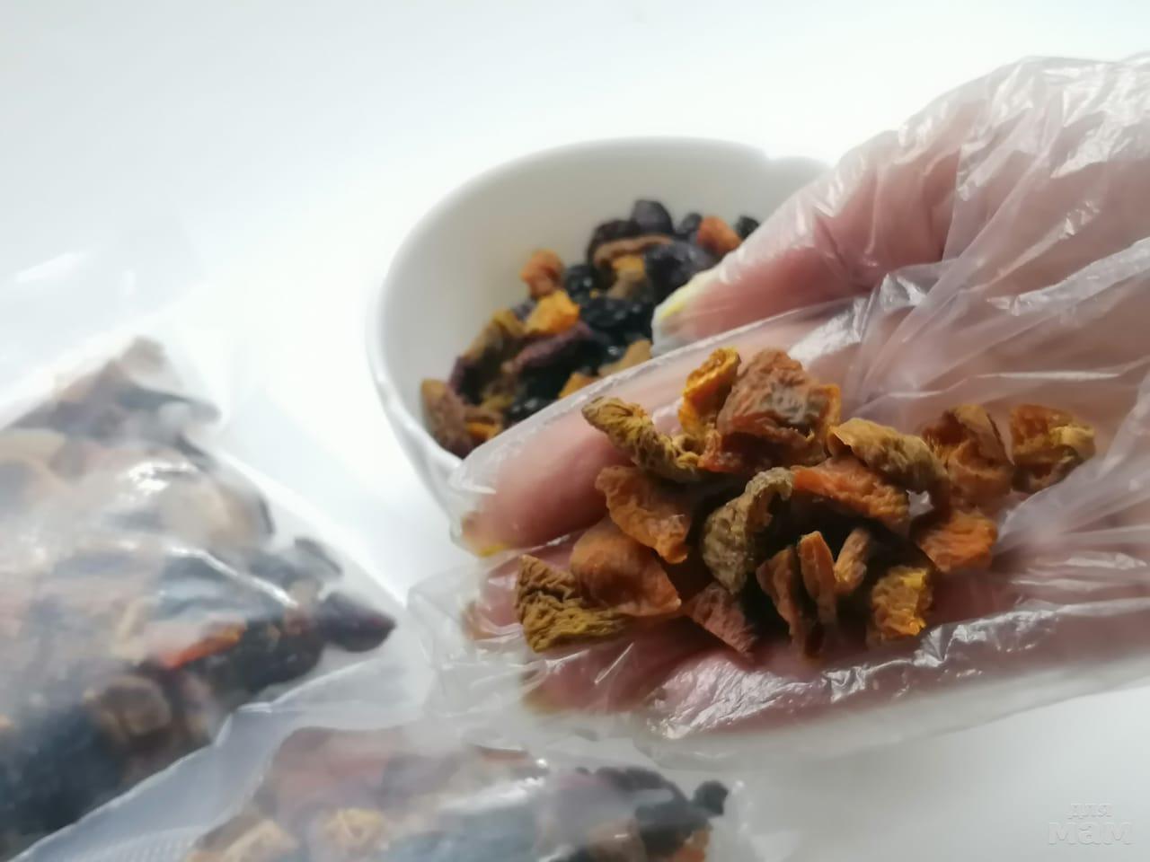 Именно эту смесь я не вакумирую сильно. Спасибо абрикосу за это. Иначе вы получите один сплошной слипшийся пельмень. Но все ягодки надежно упакованы в такие пакеты. Ни моль, ни другой вредитель в него не проберутся. Хранить как обычно все сухофрукты. При соблюдении правил хранения не теряют своих свойств до года.