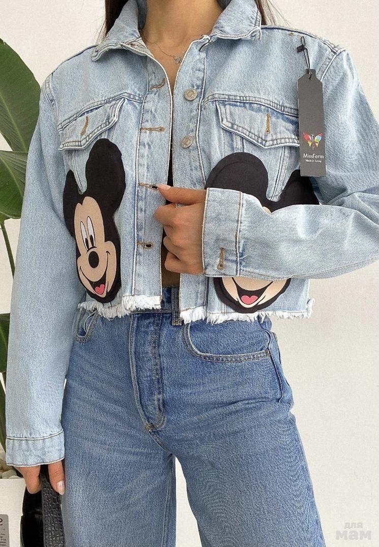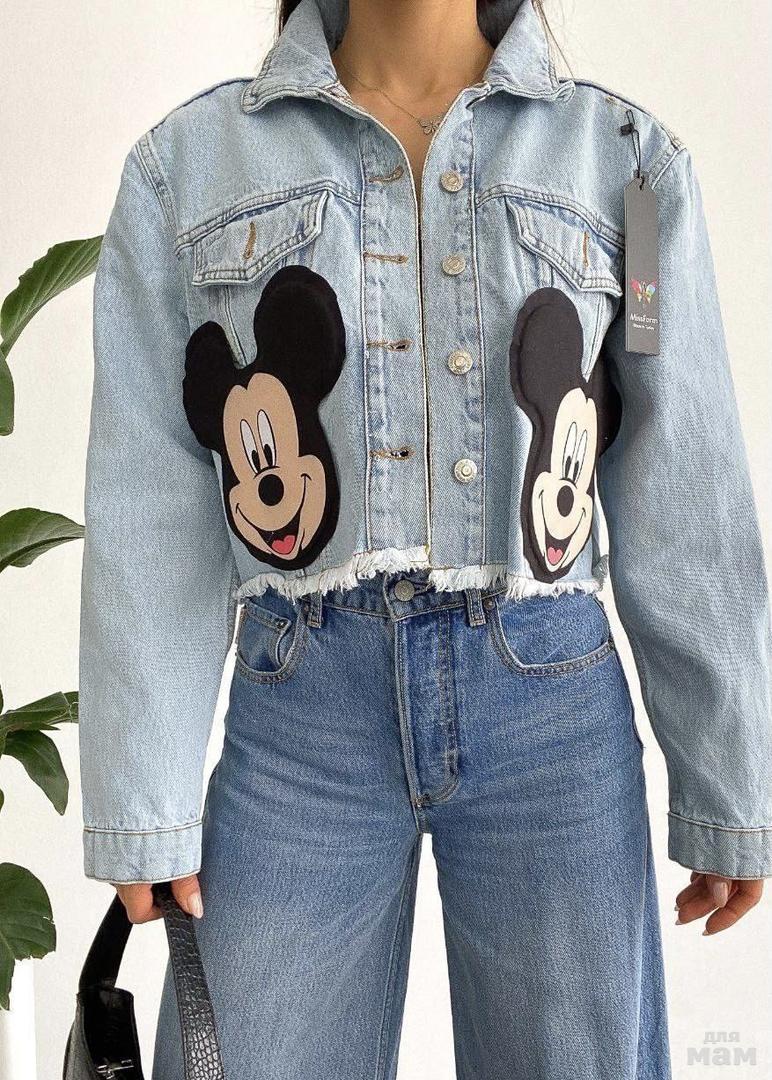 Укороченные джинсовки с печворком Микки🔥 Стильная модель в светло голубой варке🌟 Яркий вариант для незабываемых моментов💋