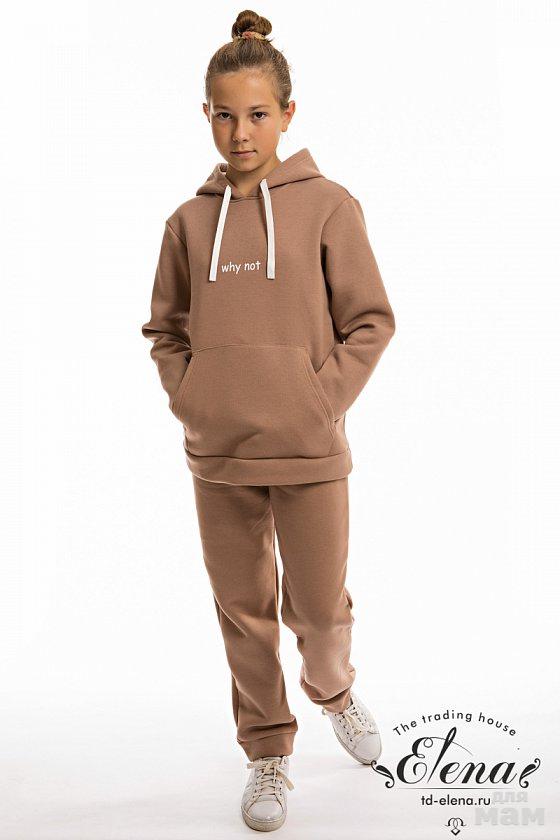 Тёплый костюм свободного кроя выполнен из мягкого и шелковистого полотна с имитацией ручной вязки.