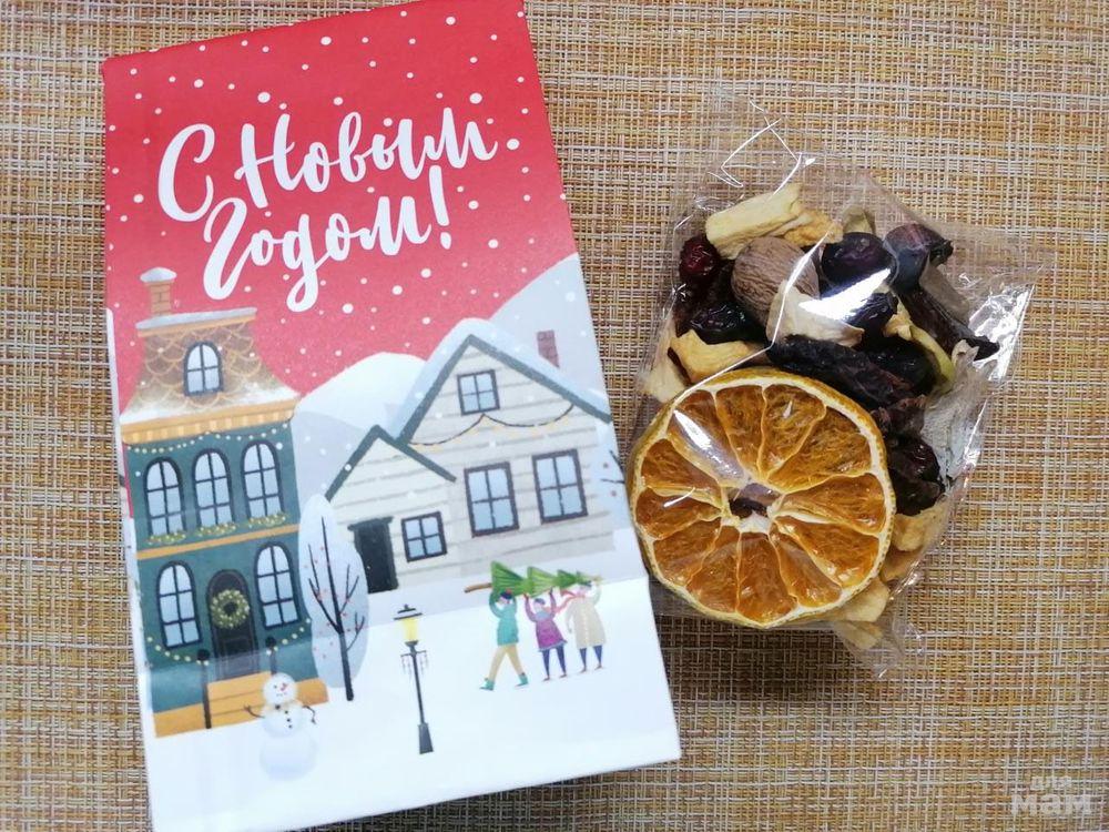2) Согревающий подарок с самыми теплыми чувствами. В набор входит смесь для глинтвейна 50гр и фруктового ассорти 50гр. Открытка