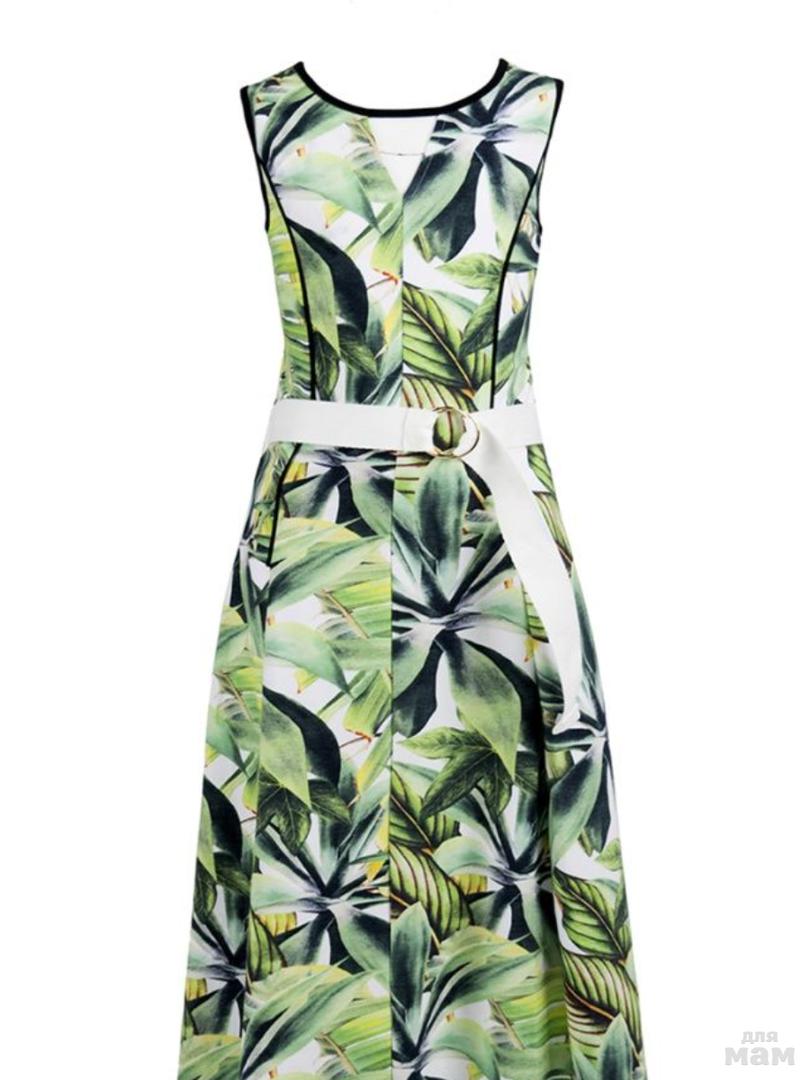 Платье для девочки. Длина макси. Модель выполнена из принтованного трикотажа, без рукавов, округлый вырез горловины украшен контрастным кантом. На спинке V-образный вырез. На поясе шлевки и съемный пояс из однотонной ленты с пряжкой на кольцах.