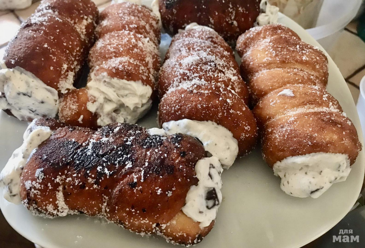 оставить под плёнкой на 1 час. И жарить во фритюре, обвалять в сахаре и начинить кремом.