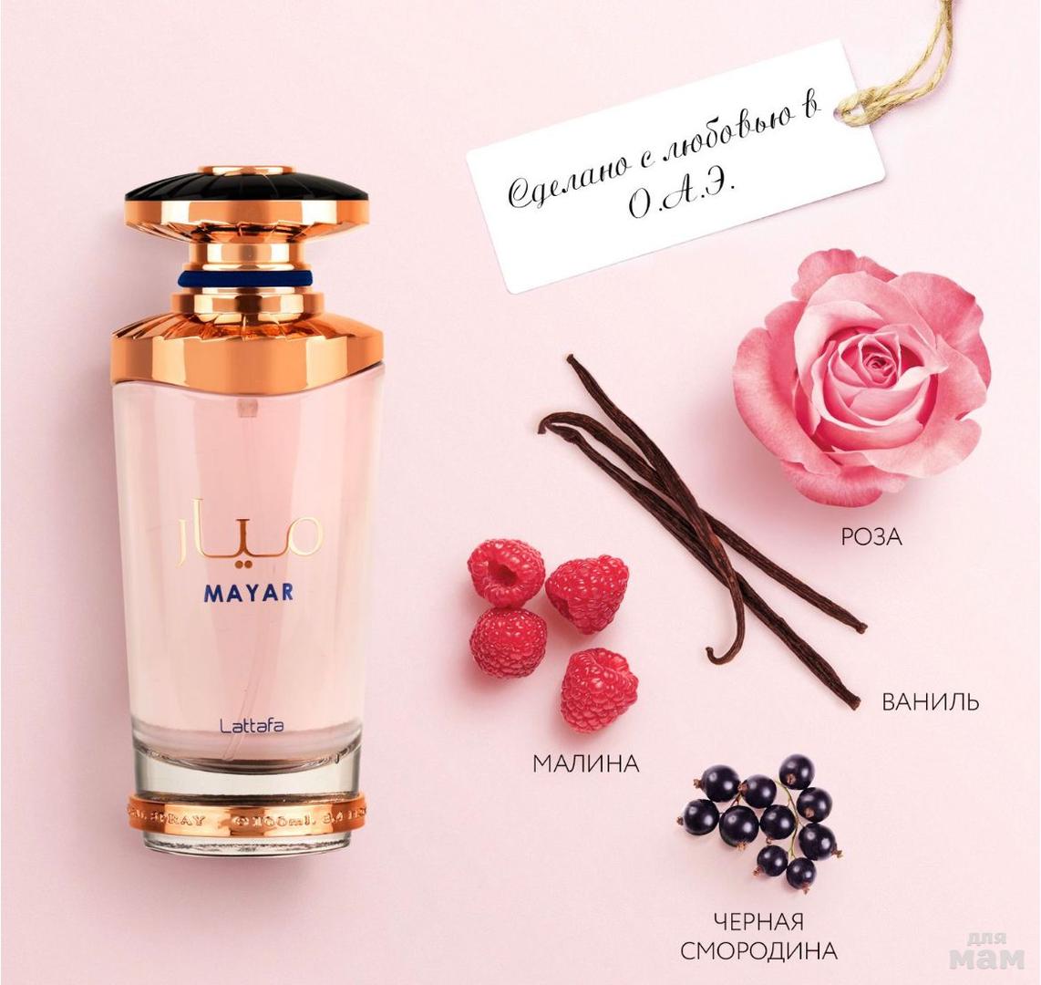 Lattafa Mayar — элегантный женский цветочно-фруктовый парфюм, выпущенный под маркой арабского парфюмерного бренда Lattafa. Аромат является идеальным дополнением к любому женскому образу. Композиция проста, изящна и безукоризненна в своем звучании. В верхнем аккорде парфюма запах сочного личи соединяется с ароматом бархатистых ягод малины и терпковатой сладостью ягод черной малины. Им на смену приходит нежный, как прикосновение крыла бабочки, цветочный аккорд из нежной розы и пьянящего жасмина, который звучит на мягком и притягательном ванильно-мускусном фоне, создавая легкую, как волшебный палантин ароматическую кисею Lattafa Mayar, переливающуюся нежными, прохладными ароматическими оттенками.