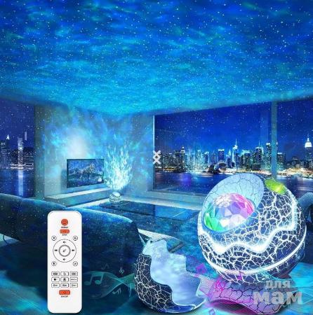 Ночник проектор Яйцо дракона превратит комнату в звездное небо. Расслабляющая атмосфера поможет легко засsgfnm детям и взрослым. Помимо красивого свечения у данной модели есть еще функция цветомузыки. Через Bluetooth можно включать любимые мелодии. Помимо этого можно слушать встроенные звуки природы и белый шум. На ночнике порядка 19 разных звучаний. Встроенный аккумулятор позволяет не зависеть от расположения розеток в помещении. Зарядка аккумулятора осуществляется через USB-кабель.