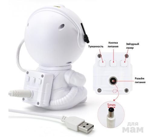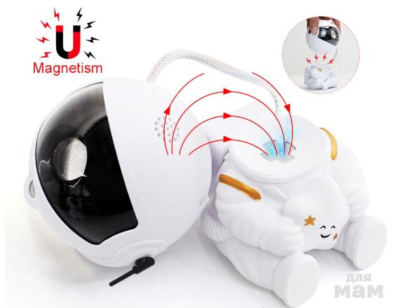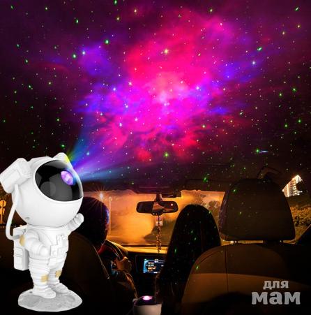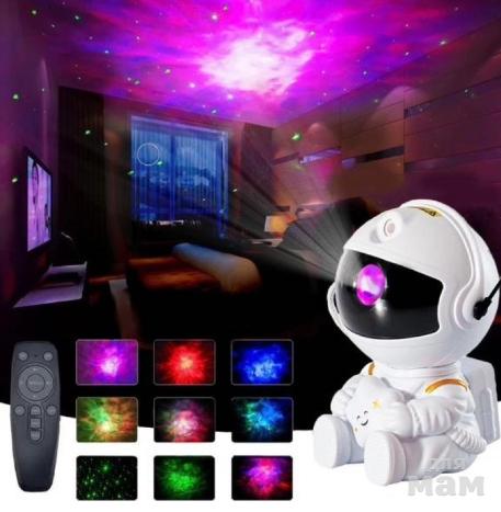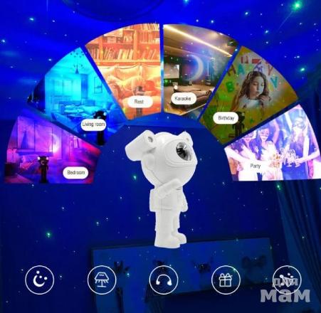 Ночник проектор космонавт проецирует звездное небо. Взрослым и детям это дарит незабываемые эмоции и впечатления. Плавное вращение звездного неба поможет успокоиться перед сном. Многообразие видов проекций сделает интересным наблюдение за звездами, не выходя их дома. Ночник хорошо подойдет для детских комнат и спальни. Взрослым он поможет создать романтичную атмосферу. Цвет туманности можно регулировать.