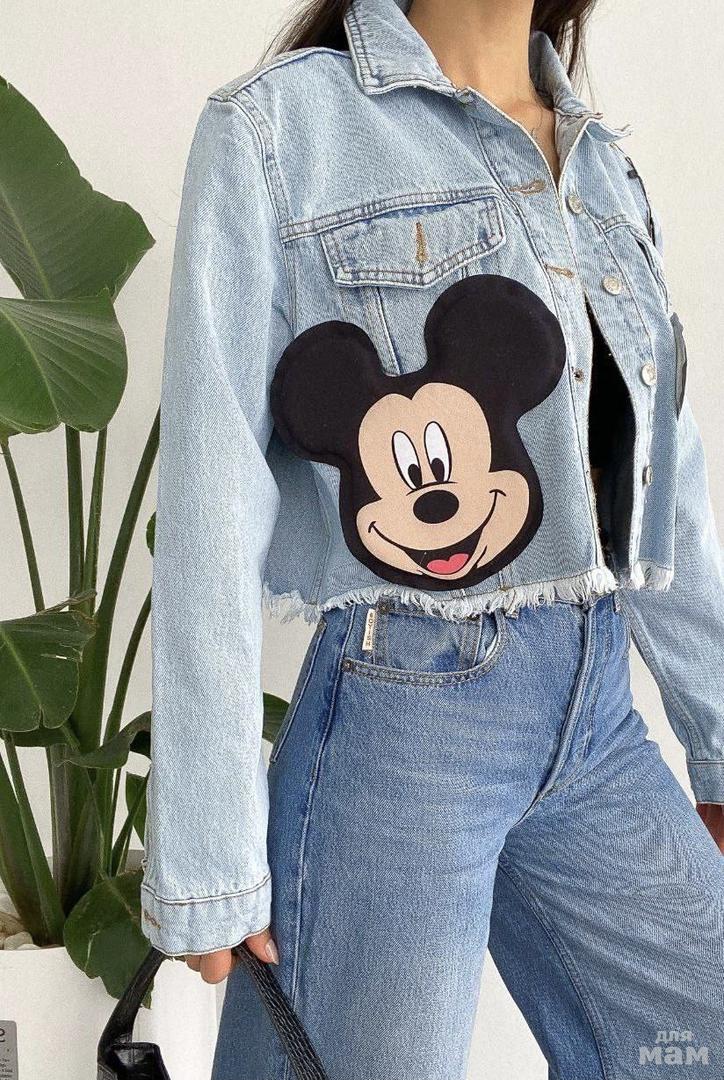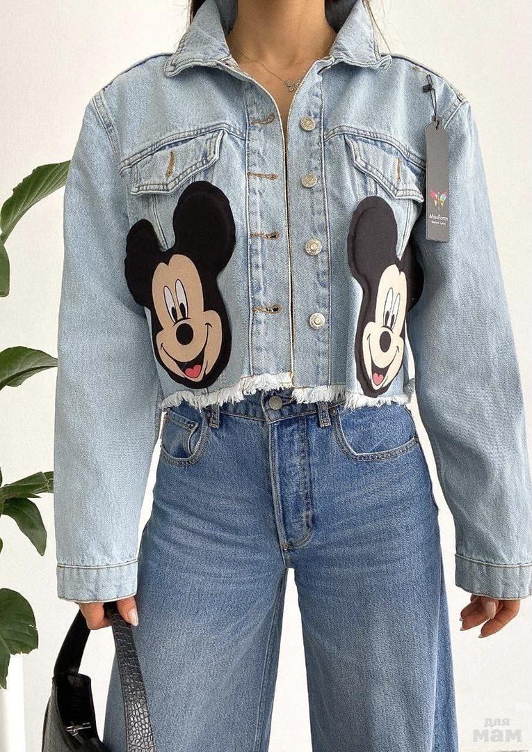 Укороченные джинсовки с печворком Микки🔥 Стильная модель в светло голубой варке🌟 Яркий вариант для незабываемых моментов💋