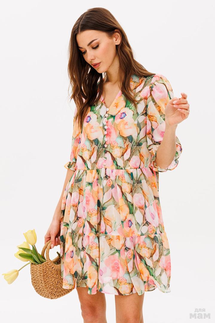 Платье с V-образым вырезом А-образного силуэта, отрезное по линии талии. Рукав втачной короткий со сборкой по окату и внизу на резинке. По переду лиф имитацией застежки на новестные петлие-пуговицы. Полочка и спинка с притачным слегка присборенным воланом по низу. Платье на подкладке.