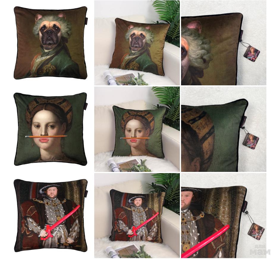 Подушки выполнены из мягкого и приятного на ощупь велюра плотностью 280г/м2. Лицевая сторона дизайнерский принт по мотивам известных шедевров, обратная сторона – однотонный велюр. Подушки изготовлены с кантом и на молнии, что обеспечивает легкость использования и ухода за ними.