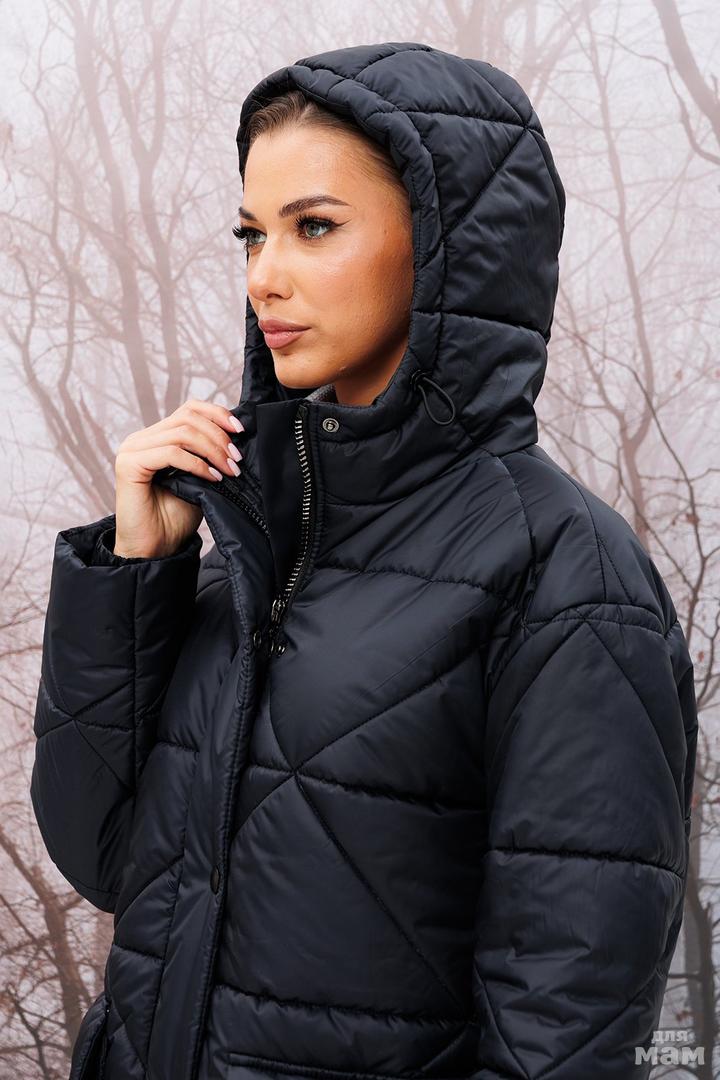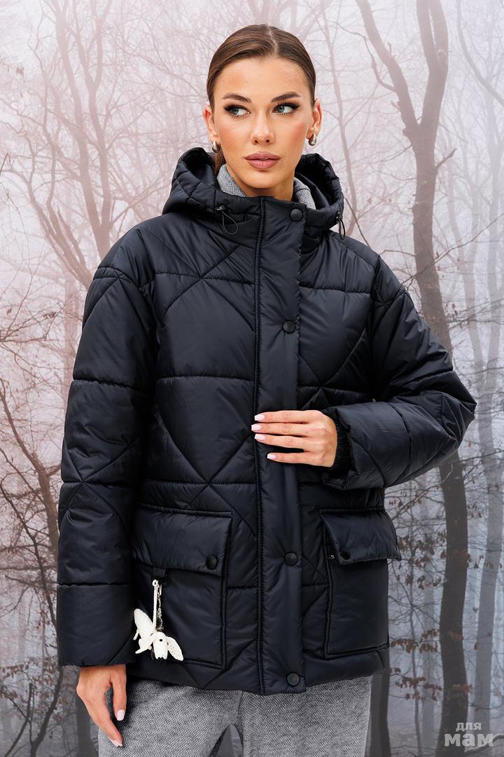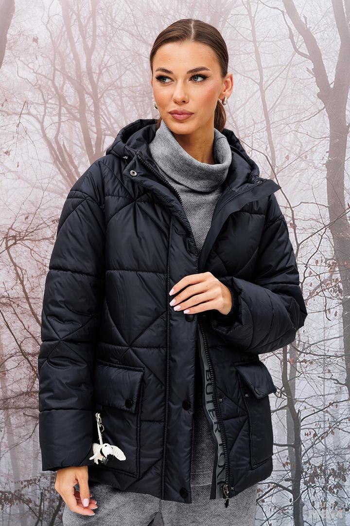 Куртка прямого силуэта со спущенным плечом с центральной застежкой на тесьму молнию и планкой с застежкой на кнопки. По переду накладные карманы с клапаном с застежкой на кнопки. По низу рукавов резинка. Куртка с несъемным капюшоном, в который вставлена эластичная тесьма с фиксаторами. Куртка из плащевой ткани с фигурной стёжкой на синтепоне и подкладке. Декоративные съемные элементы не входят в комплект.