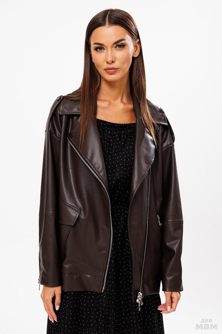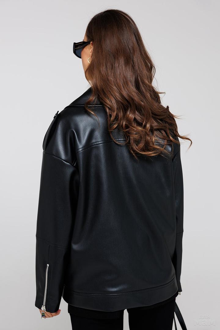 Куртка из эко-кожи со спущенной линией плеча. Рукав втачной отрезной по линии локтя, внизу обработана молния. Полочка с асимметричной застежкой на тесьму-молнию, с накладным карманом по правой половинке куртки и карманом с застежкой на тесьму-молнию по левой половинке куртки. По плечам погоны с застёжкой на кнопку. Спинка с кокеткой. По низу куртки притачная планка. Воротник стояче-отложной на притачной стойке. Куртка на подкладке.