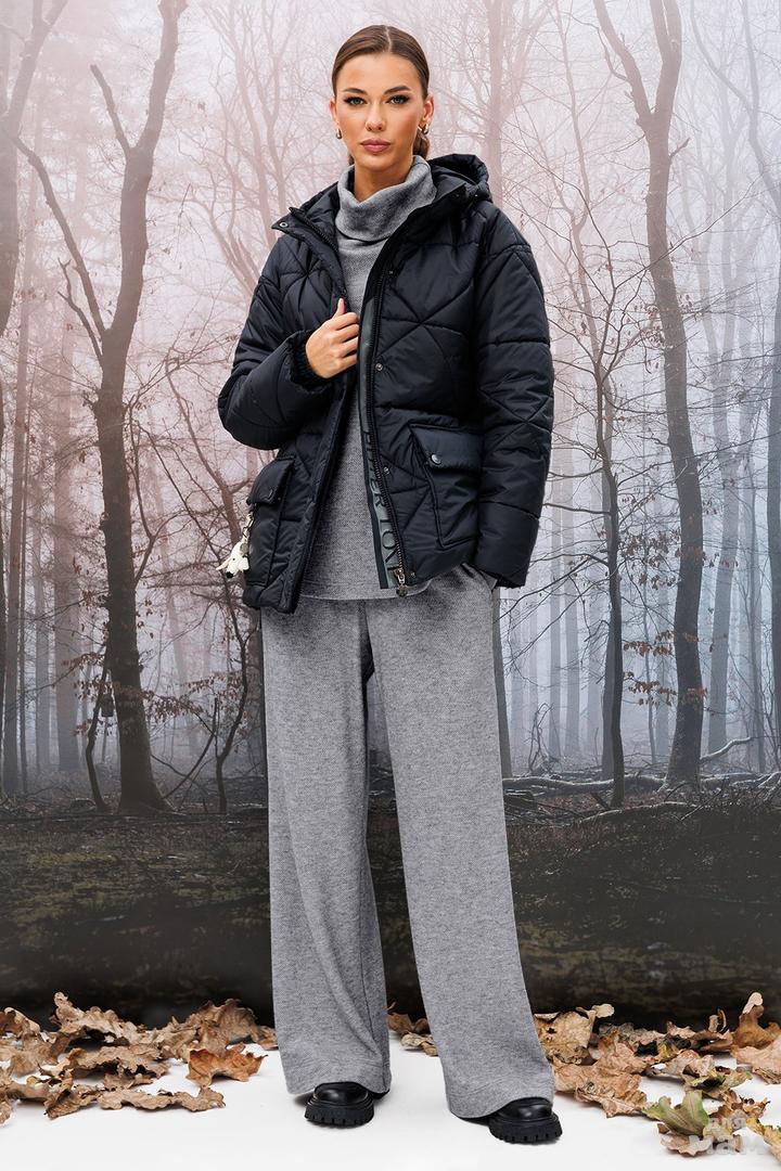 Куртка из пальтовой ткани прямого силуэта, со спущенной линией плеча. Рукав одношовный внизу на отсроченной планке из основной ткани на резинке. Полочка с центральной застежкой на тесьму-молнию и настрочными карманами и диагональными подрезами. Спинка с центральным швом и кокеткой. По низу куртки отстроченная планка из основной ткани на резинке. Воротник стойка. Куртка на подкладке. Декоративные съемные элементы не входят в комплект.