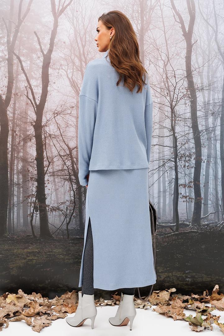 Комплект 2-ух предметный состоящий из джемпера и юбки. Джемпер прямого силуэта со спущенной линией плеча. Рукав втачной длинный, внизу с отверстием для большого пальца. По переду пришито сердце с гравировкой "BUTER". Внизу по боковым швам обработаны разрезы. Воротник стойка с отворотом. Юбка прямого силуэта на притачном отстроченном поясе на резинке и втянутым в него шнурком из основной ткани. По левому боковому шву внизу обработан разрез.