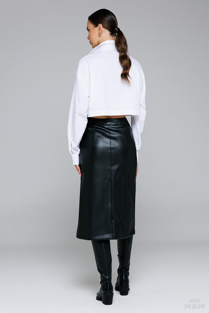 Юбка из экокожи А-образного силуэта, длинной миди. На притачном поясе. Перед с центральной застежкой на тесьму молнию. Спинка с центральным швом и вытачками. Юбка без подкладки.