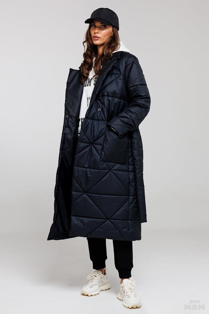 Пальто стеганное прямого силуэта, двубортное, длинной миди, с втачным одношовным рукавом. Полочка с застежкой на пришивные кнопки и накладными карманами. Воротник пиджачного типа с отрезной стойкой. Пальто на подкладке. Пояс в комплекте.
