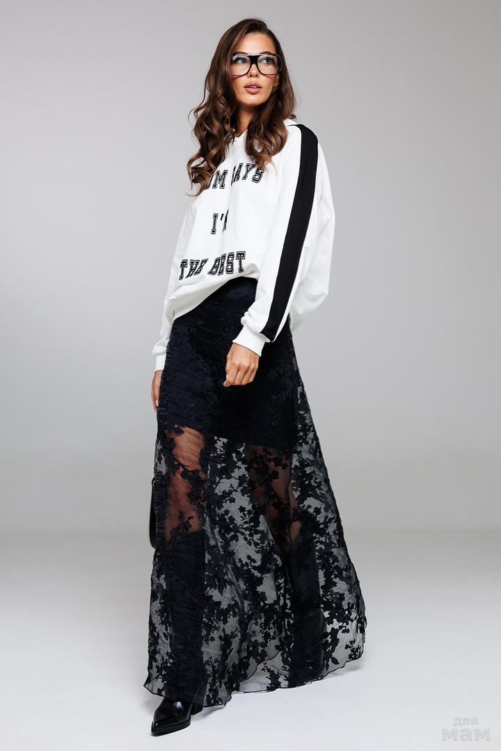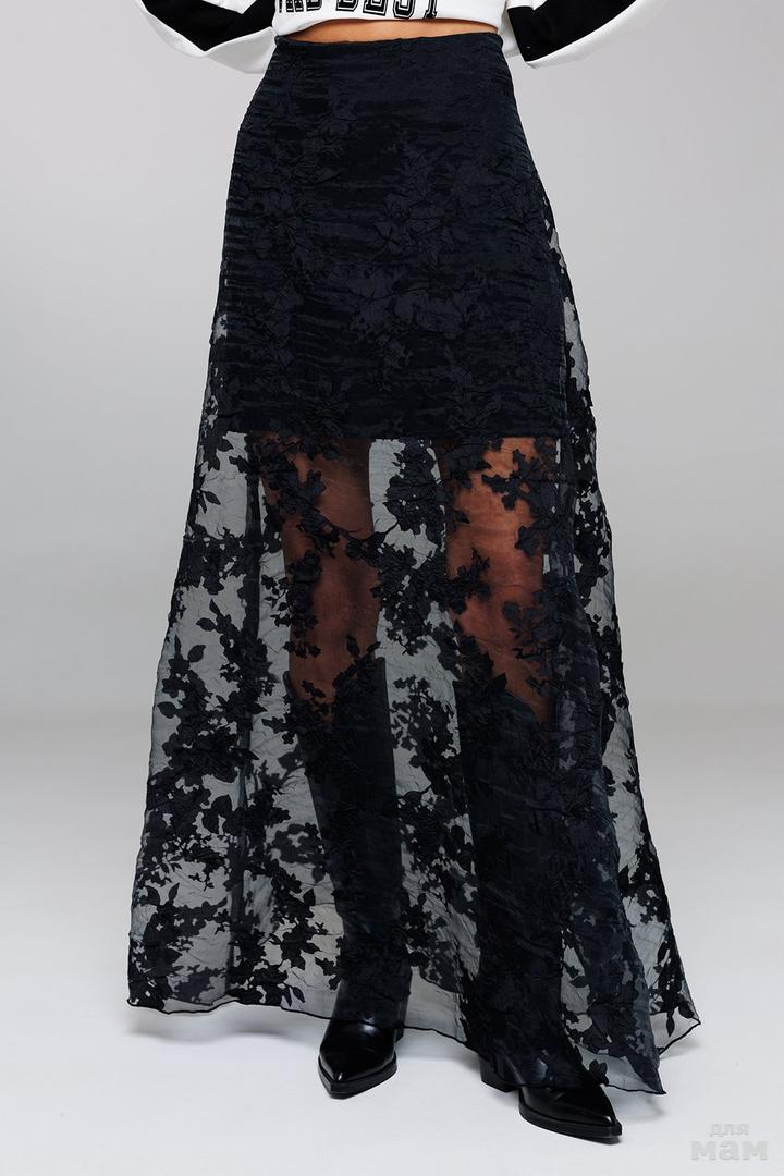 Юбка А-образного силуэта, длинная с застежкой на потайную тесьму-молнию в боковом шве. Верхняя юбка из органзы с цветочным принтом, нижняя короткая юбка из костюмной ткани. Верх юбки на обтачке.