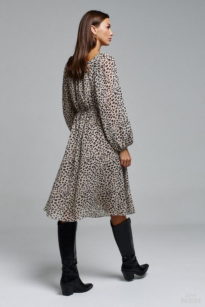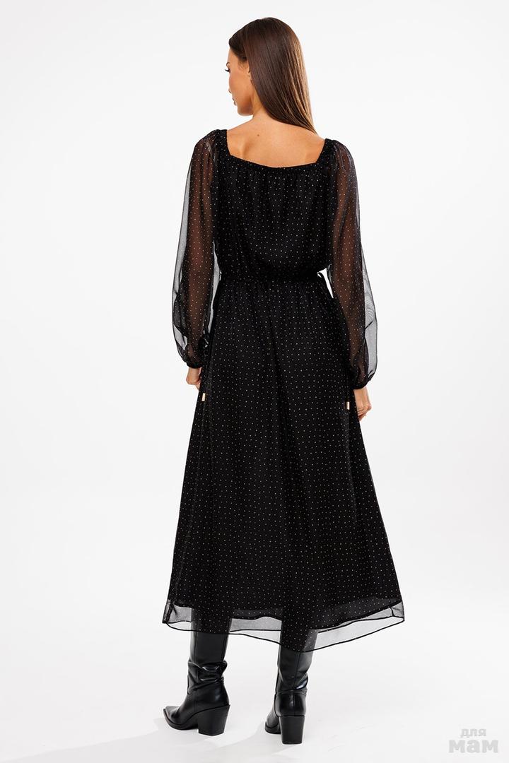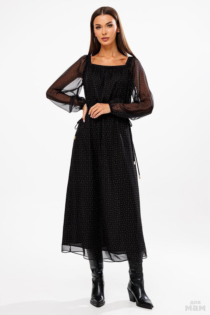 Платье длинной миди, шифоновое А-образного силуэта. Рукав длинный вверху и внизу на резинке. Горловина обработана планкой с резинкой. На талии кулиса с завязками по бокам. Платье на подкладке.