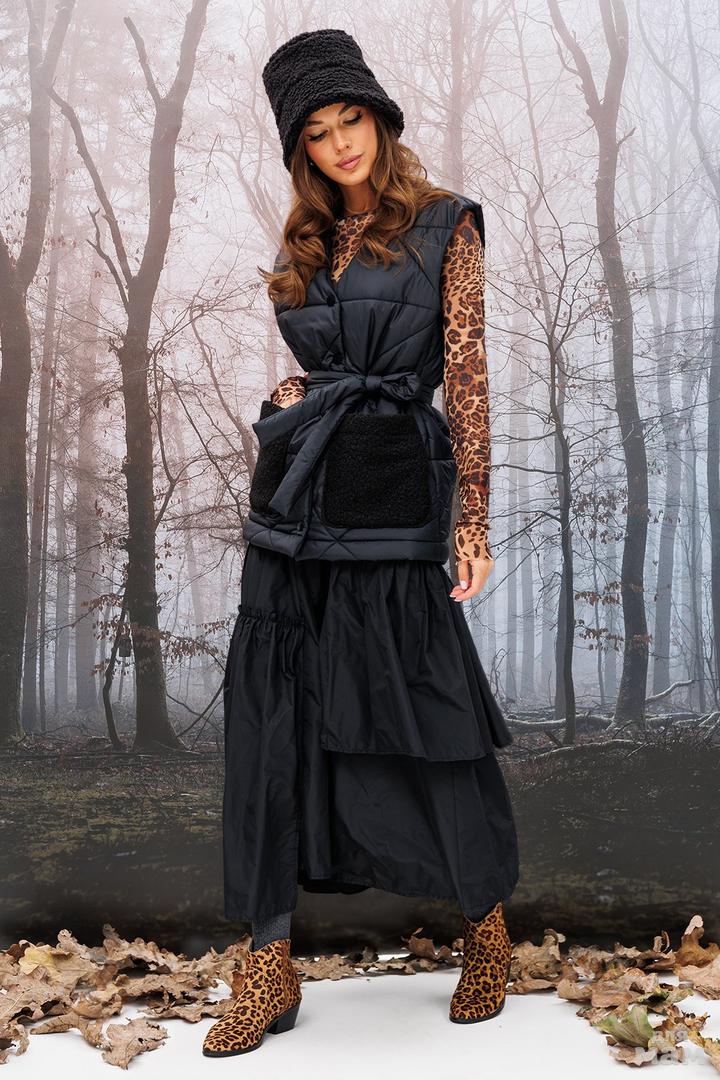 Жилет прямого силуэта, без рукавов, с V-образным вырезом. По переду застежка на кнопки, накладные карманы из отделочной ткани. Жилет из плащевой ткани с фигурной стёжкой на синтепоне и подкладке. Пояс в комплекте.