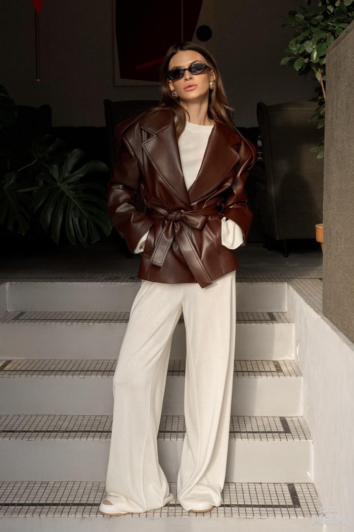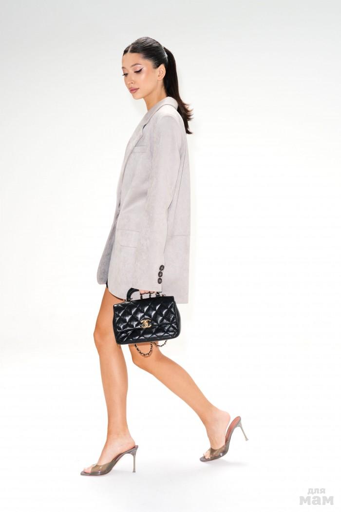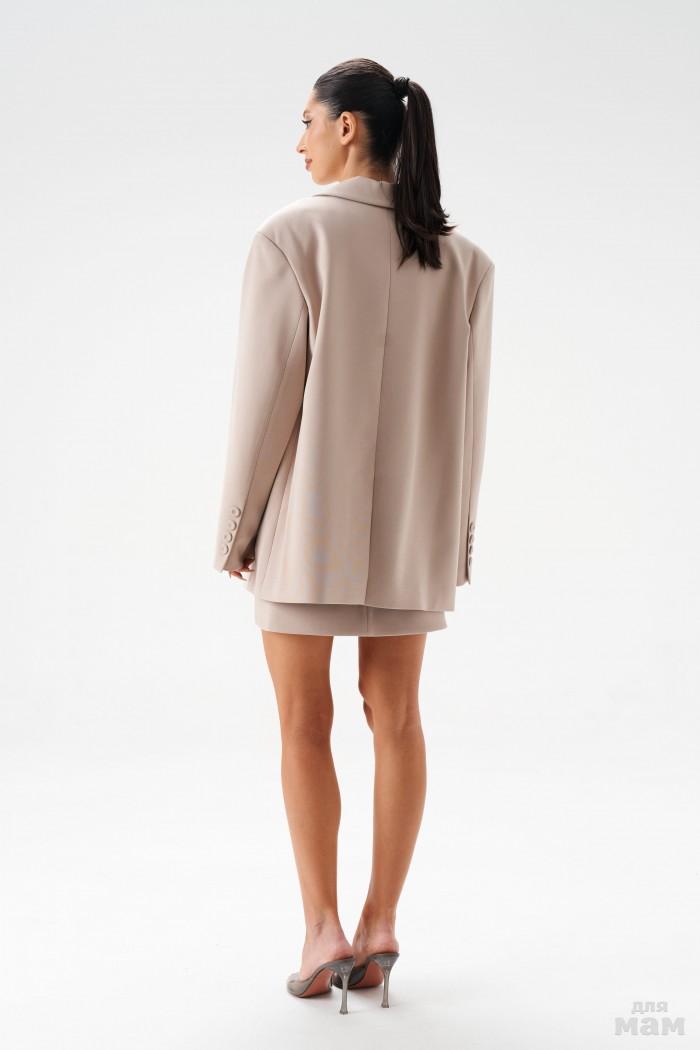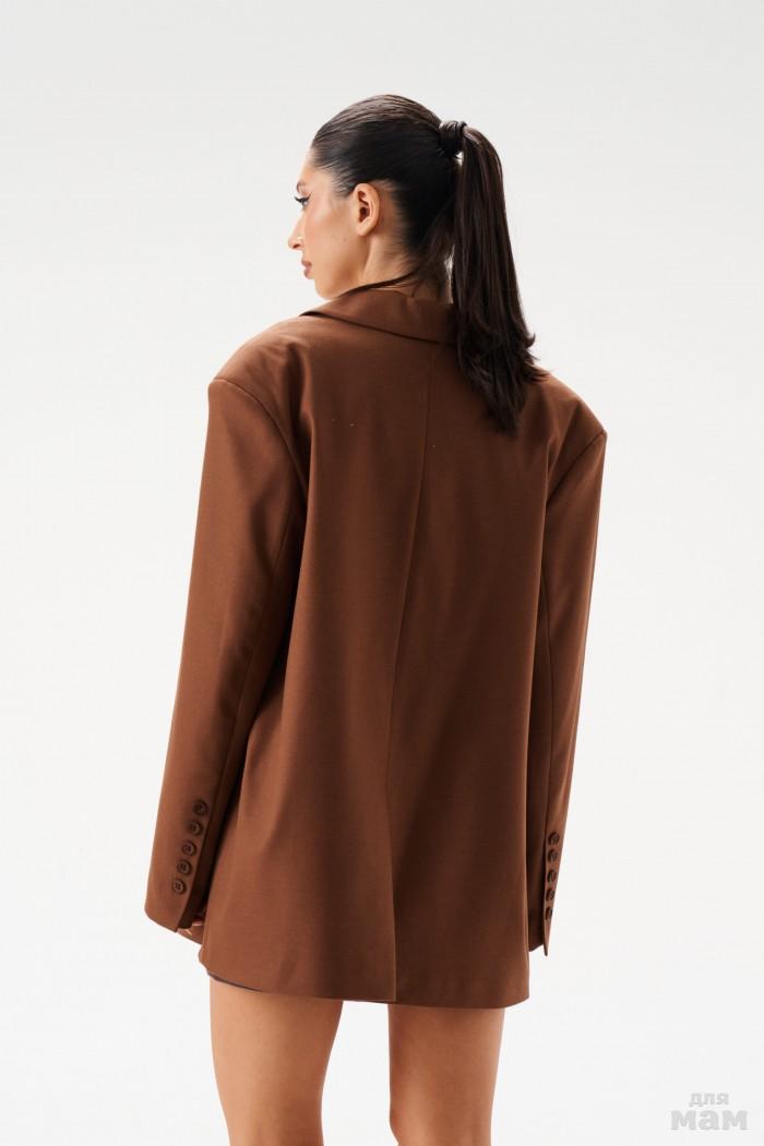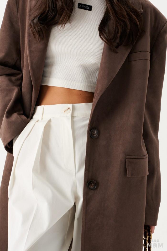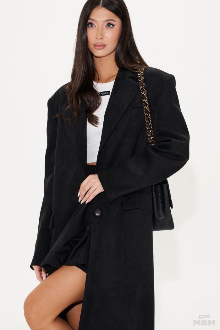 Жакет прямого свободного кроя, выполнен из имитации замши. Характеристики: прямой крой, подкладка, подплечники, отложной воротник, V образный вырез горловины, застежка центральная на две петли пуговицы, рукав втачной, по переду карманы с клапаном, в среднем шве заднего полотна изделия разрез 58 см. Длина изделия 131 см, длина рукава 64 см.