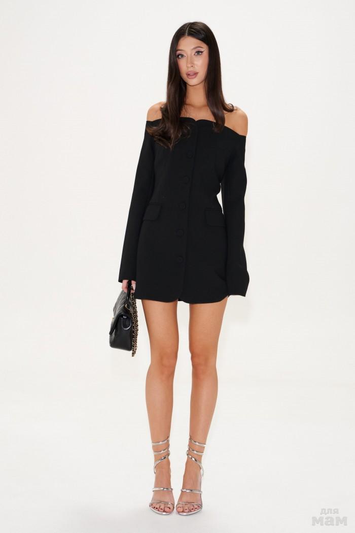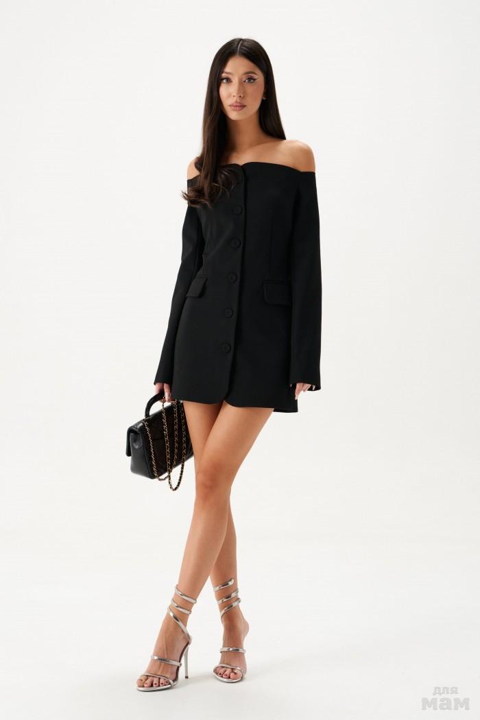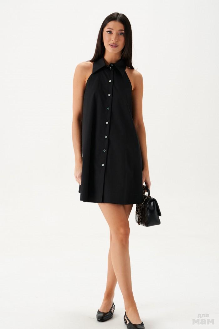Платье свободного кроя с открытыми плечами. Характеристики: свободный силуэт, застежка центральная на петли пуговички, отложной воротник. В боковых швах карманы. Длина по спинке 80 см.