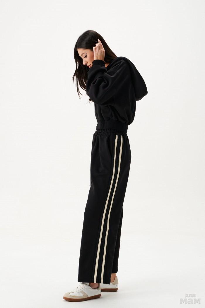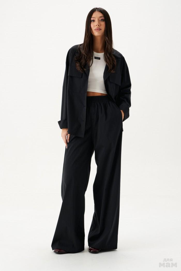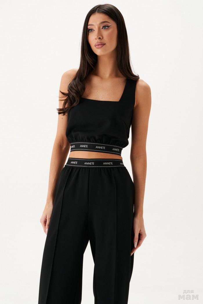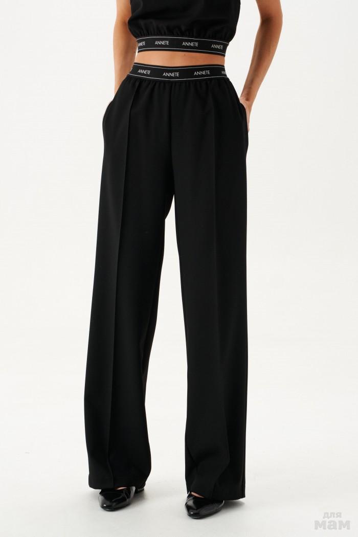 Брюки прямого кроя. Выполнены из костюмной ткани чёрного цвета. Пояс на брендированной резинке. Застёжки нет. По передней и задней частям застроченные стрелки. В боковых швах карманы. Длина 108 см
