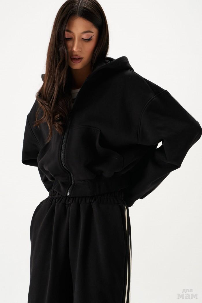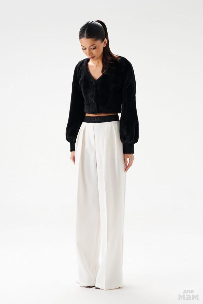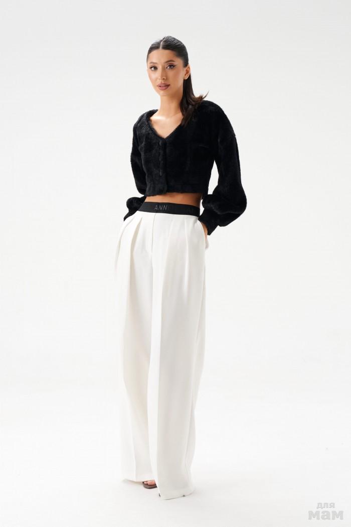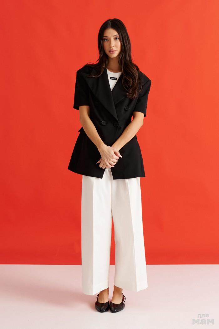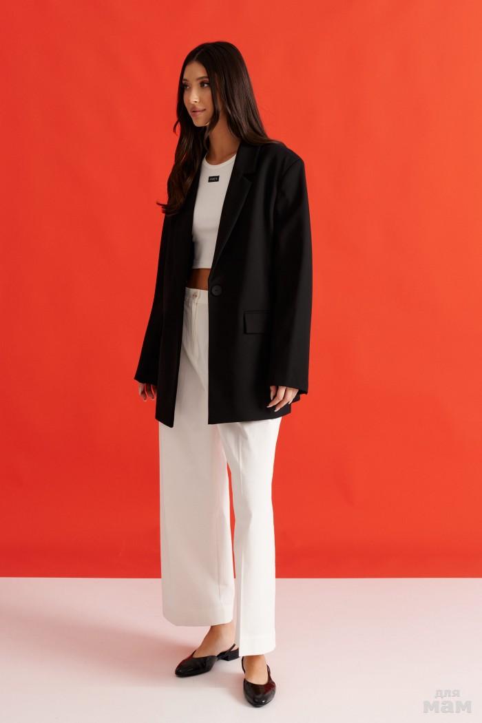 Брюки прямого кроя. Выполнены из костюмной ткани чёрного цвета. Пояс на брендированной резинке. Застёжки нет. По передней и задней частям застроченные стрелки. В боковых швах карманы. Длина 108 см
