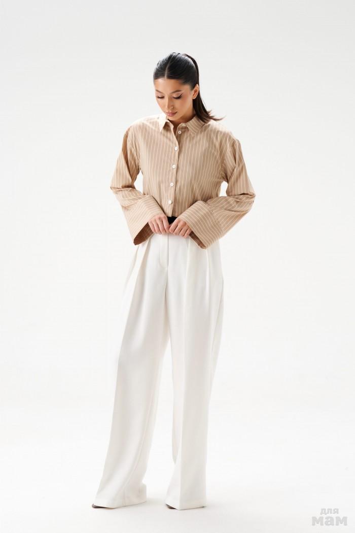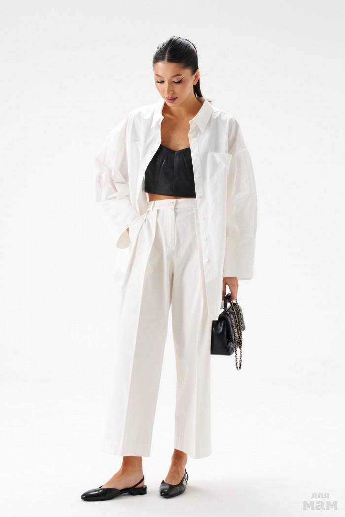 Брюки свободного кроя с акцентами декоративными складками выполнены из хлопкового полотна молочного цвета. Характеристики: свободный крой, пояс стабильный, по поясу нашиты шлевки, застёжка пуговичка, молния, глубокие декоративные складки по передней части изделия, в боковых швах косые карманы. Длина изделия 100 см.