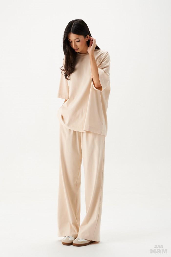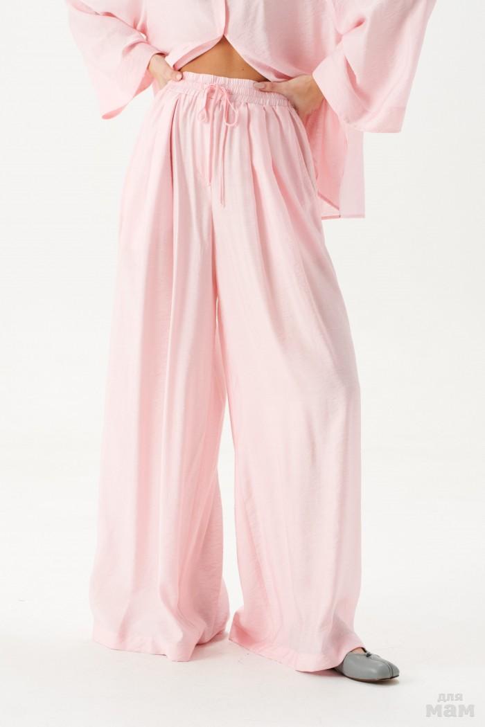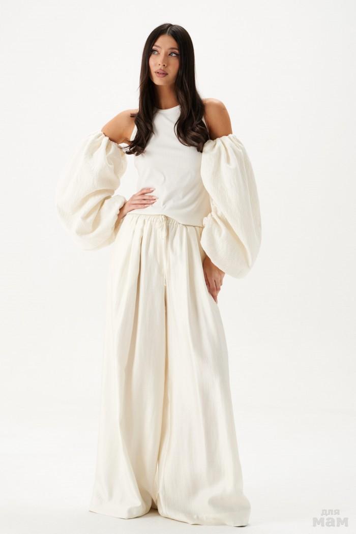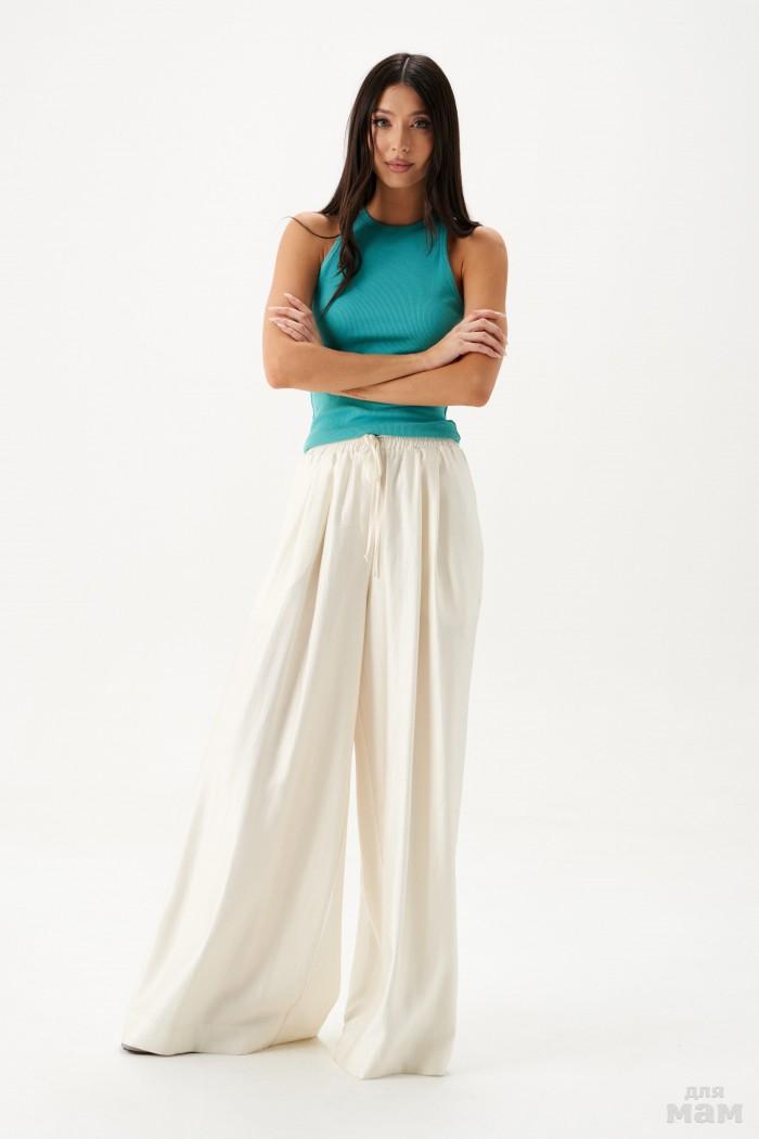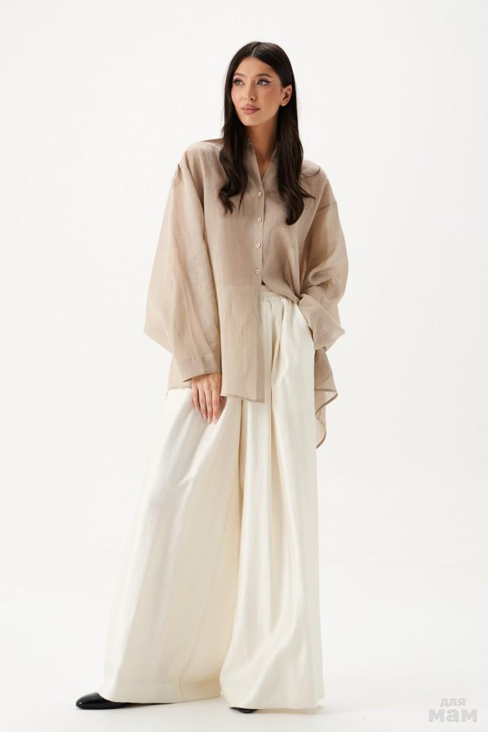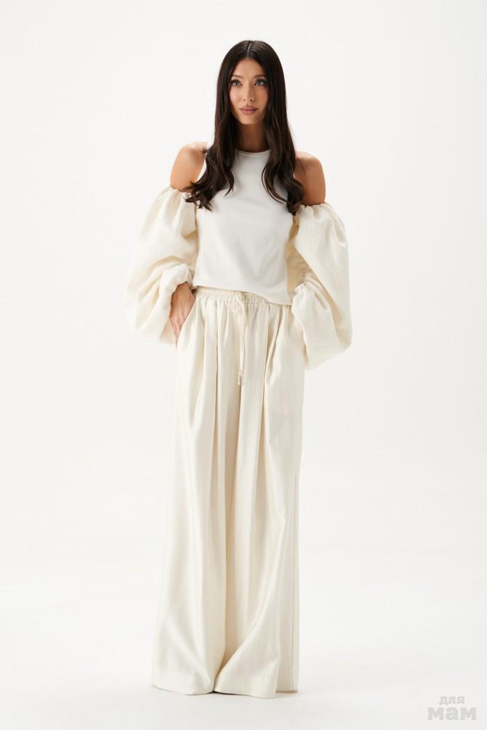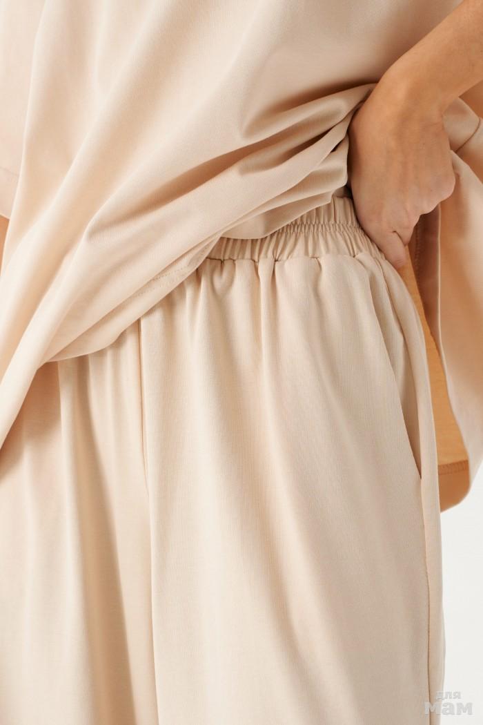 Брюки прямого свободного кроя. Выполнены из мягкой текстильной ткани светло-бежевого цвета. Пояс на резинке с кулиской. В боковых швах прорезные карманы, по задней части изделия накладные карманы. Длина 108 см (с учётом пояса)