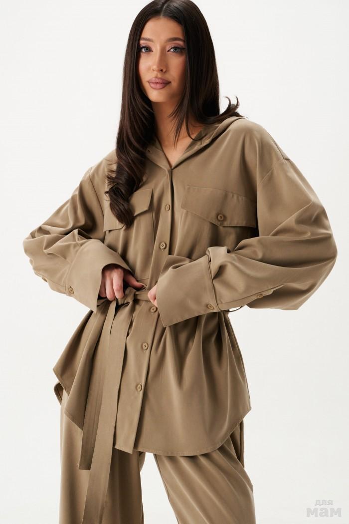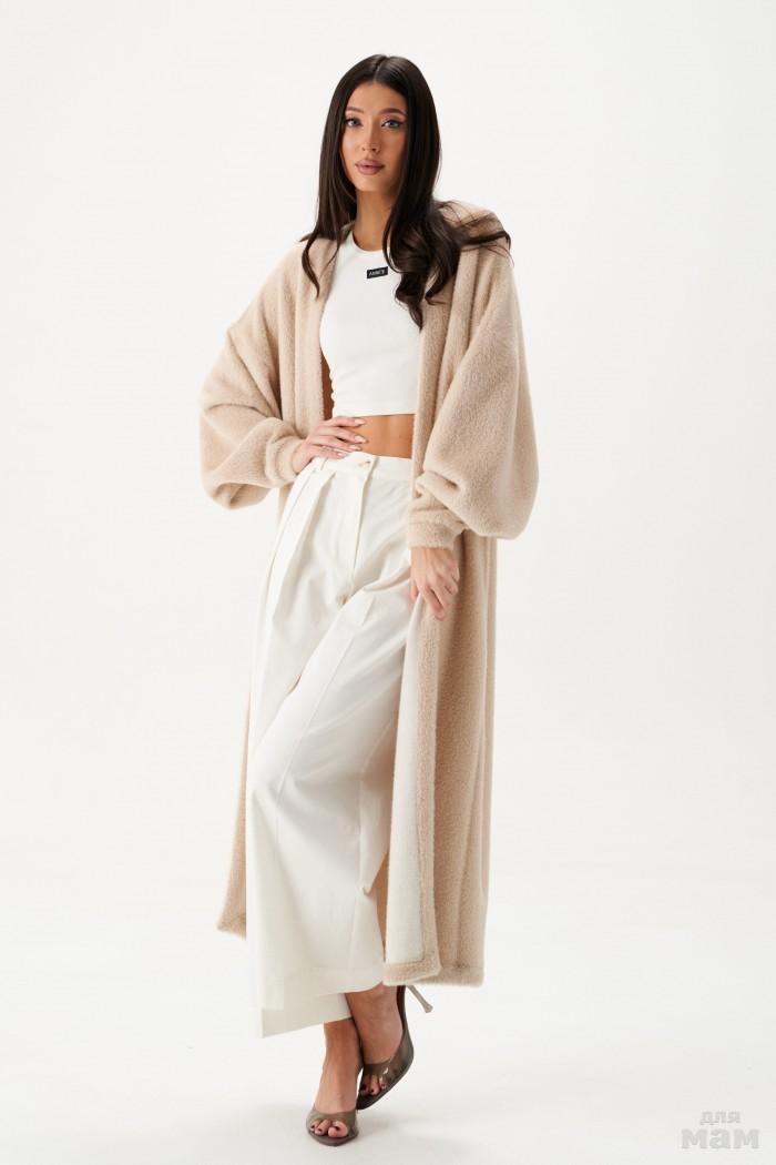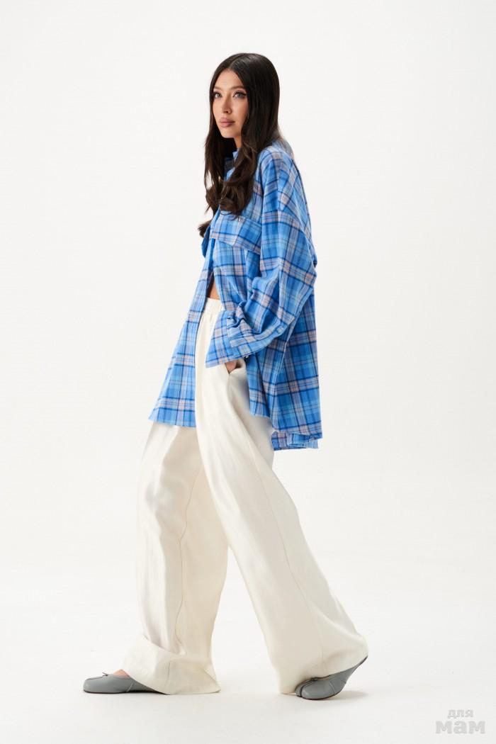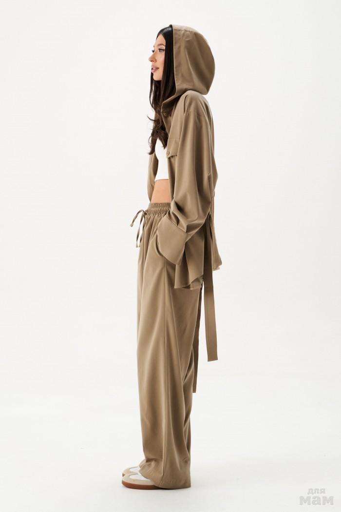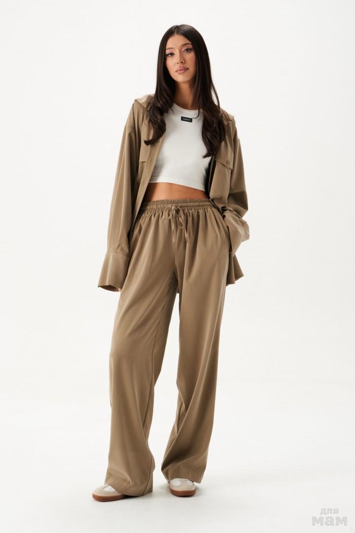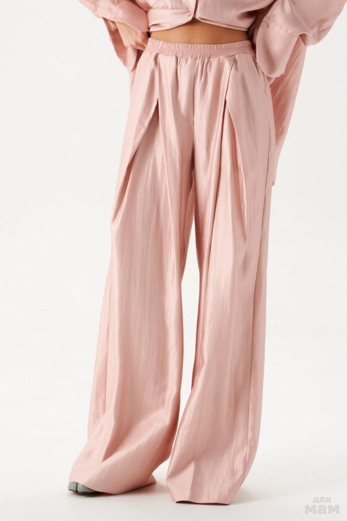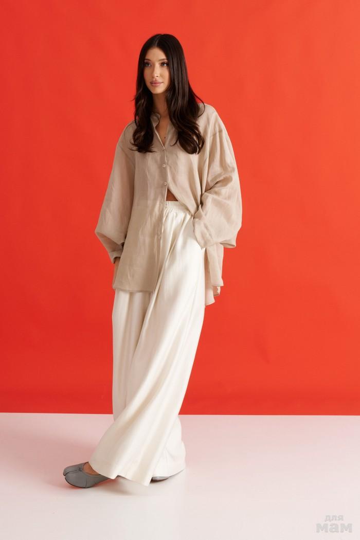 Брюки прямого свободного кроя. Выполнены из мягкой текстильной ткани светло-бежевого цвета. Пояс на резинке с кулиской. В боковых швах прорезные карманы, по задней части изделия накладные карманы. Длина 108 см (с учётом пояса)