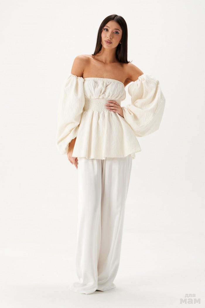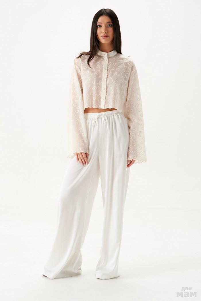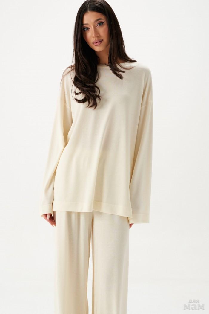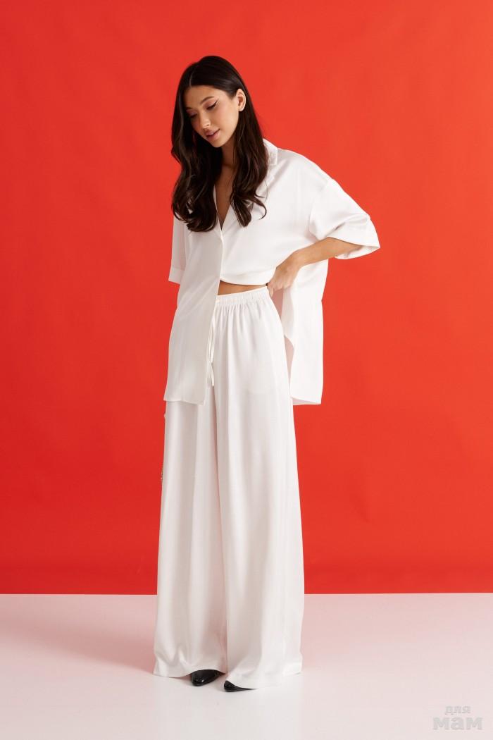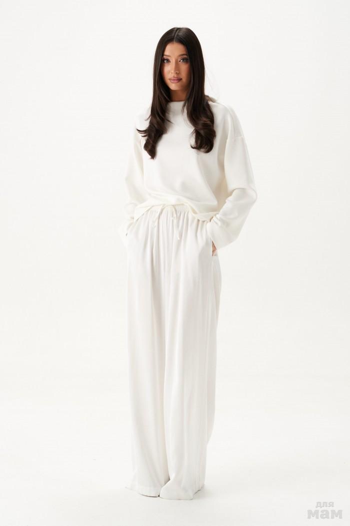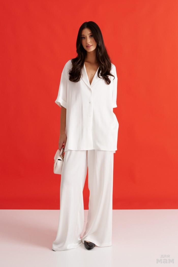 Комплект состоит из джепера и брюк выполнен из полупрозрачного полотна белого цвета. Характеристики: джемпер прямого свободного кроя, овальный широкий вырез горловины, рукав спущен. Длина по спинке от края горловины 72 см, длина рукава от края горловины 75 см. Брюки прямого, свободного кроя, пояс брюк на резинке. Длина брюк по боковой линии - 110 см.