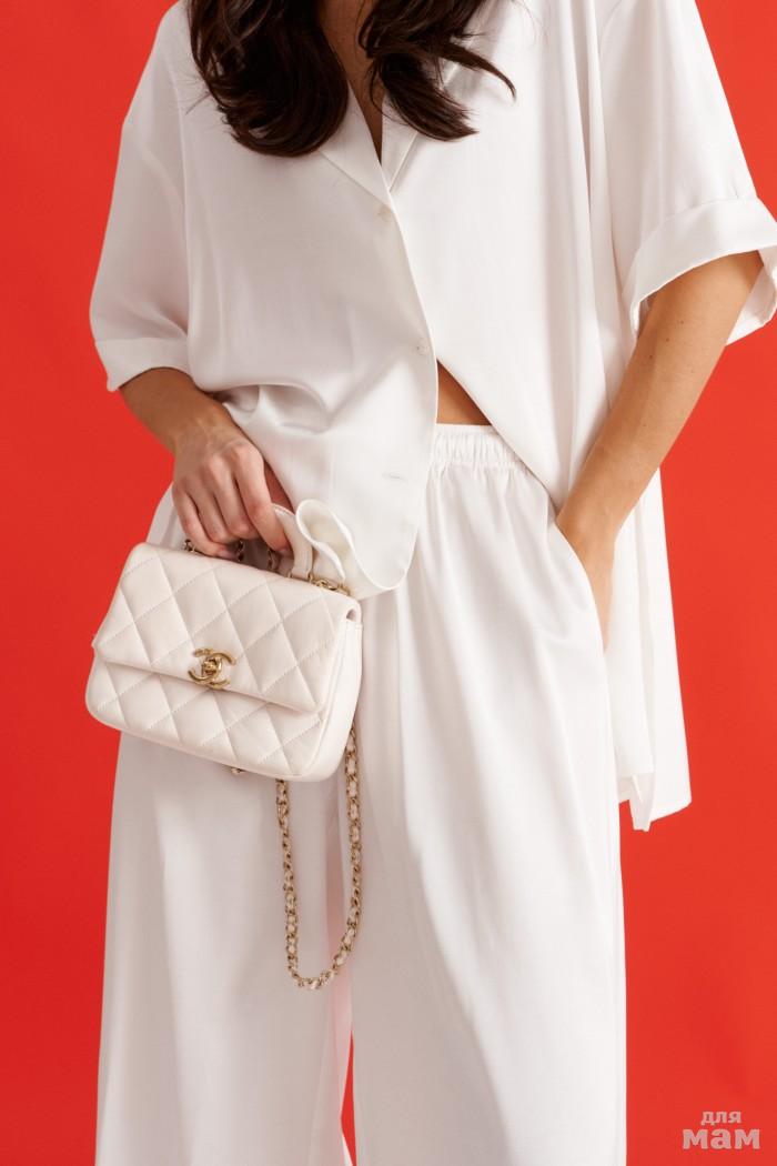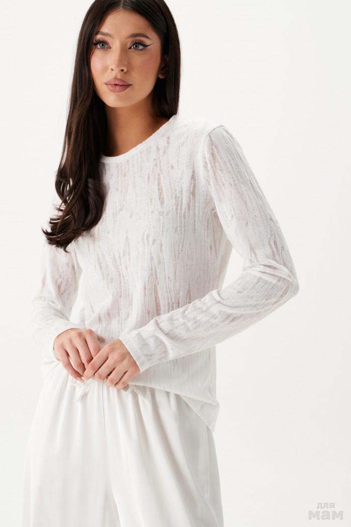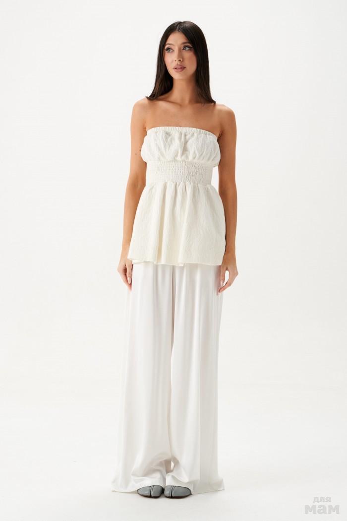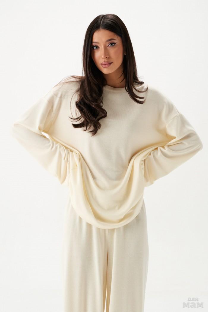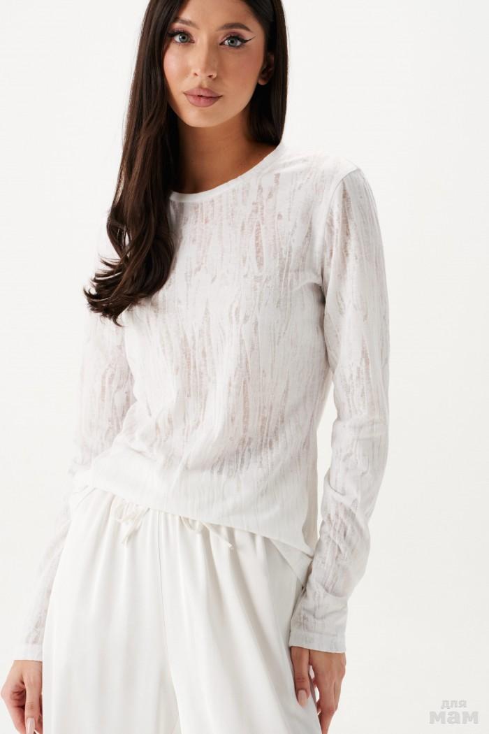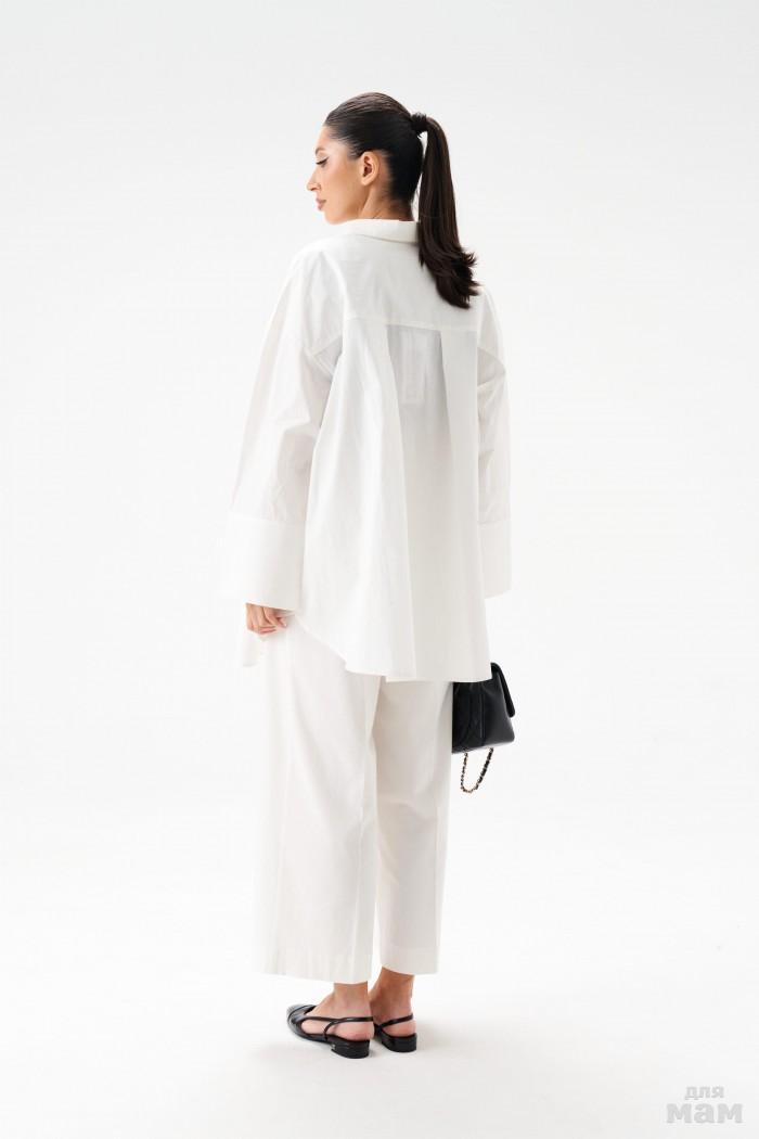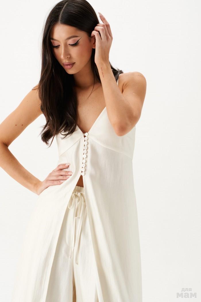 Комплект состоит из джепера и брюк выполнен из полупрозрачного полотна белого цвета. Характеристики: джемпер прямого свободного кроя, овальный широкий вырез горловины, рукав спущен. Длина по спинке от края горловины 72 см, длина рукава от края горловины 75 см. Брюки прямого, свободного кроя, пояс брюк на резинке. Длина брюк по боковой линии - 110 см.