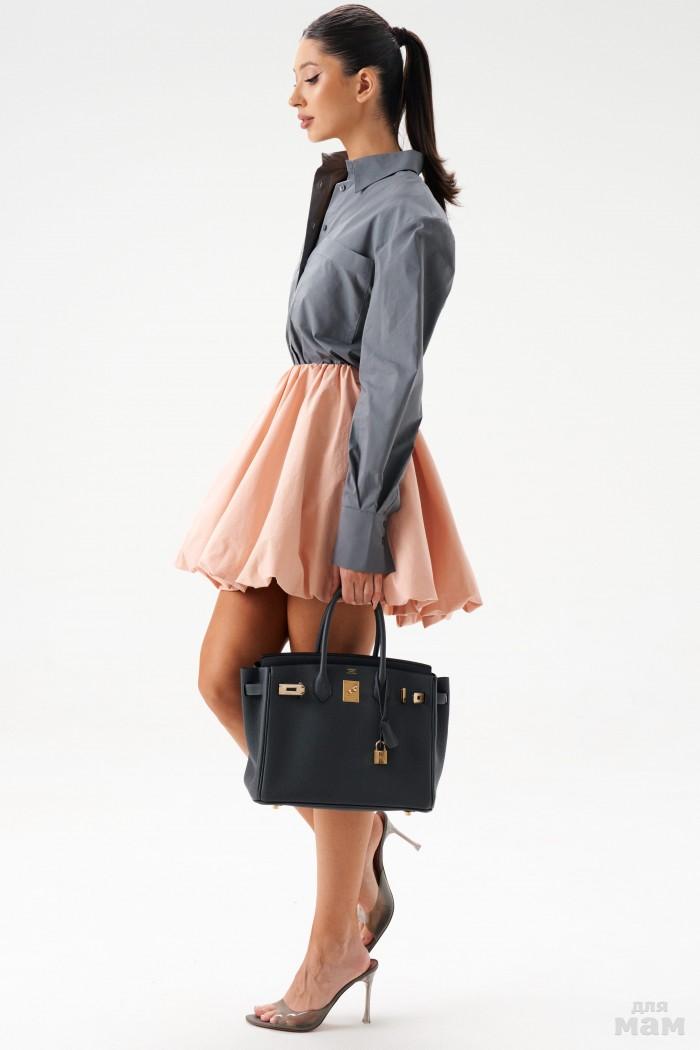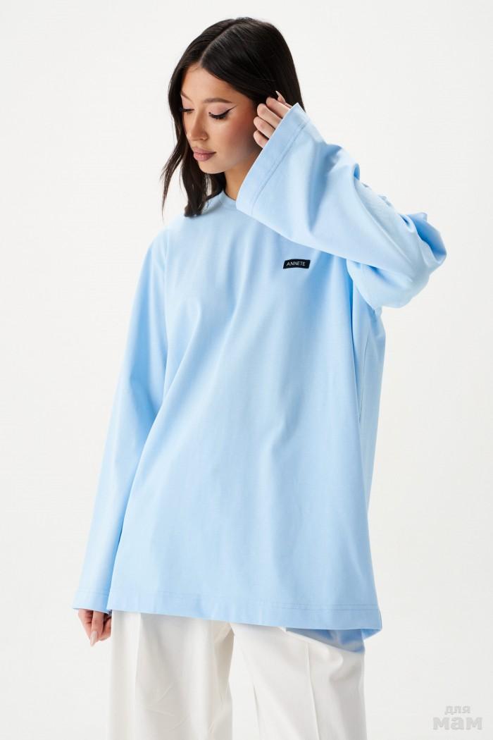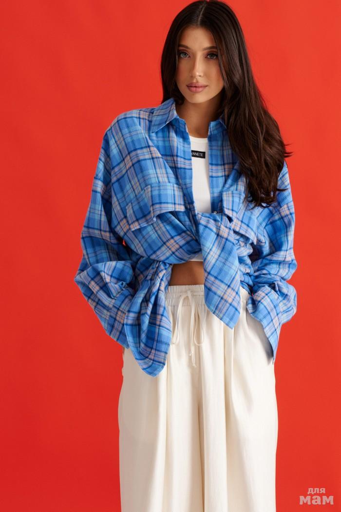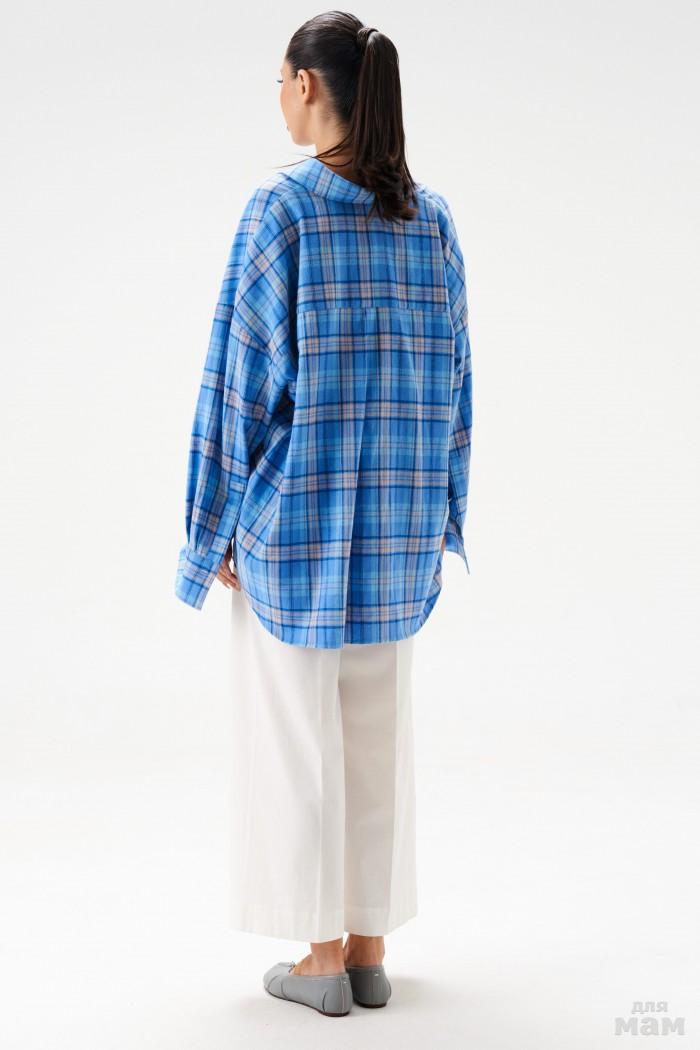 Рубашка свободного кроя выполнена из серо-голубого полупрозрачного полотна.