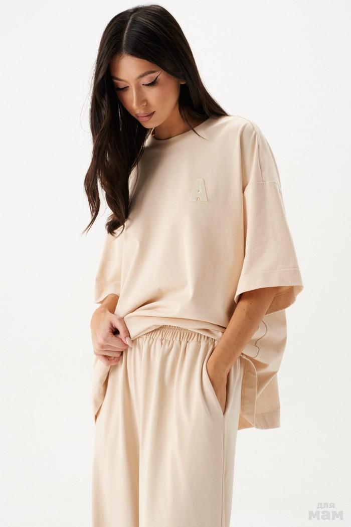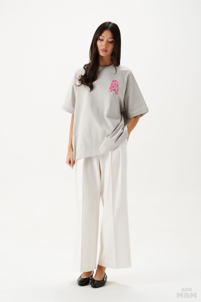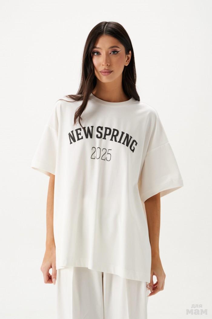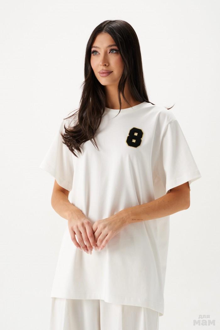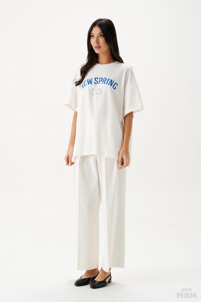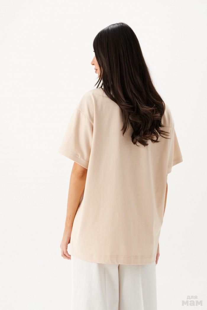 Футболка прямого свободного кроя, выполнена из хлопкового полотна тепло-белого цвета . Характеристики: прямой свободный крой, горловина овальная, рукав слегка спущен, горловина и край рукава выполнены из довяза, спереди принт черного цвета. Длина по центру спинки от края горловины 69 см, длина рукава от края горловины 39 см.