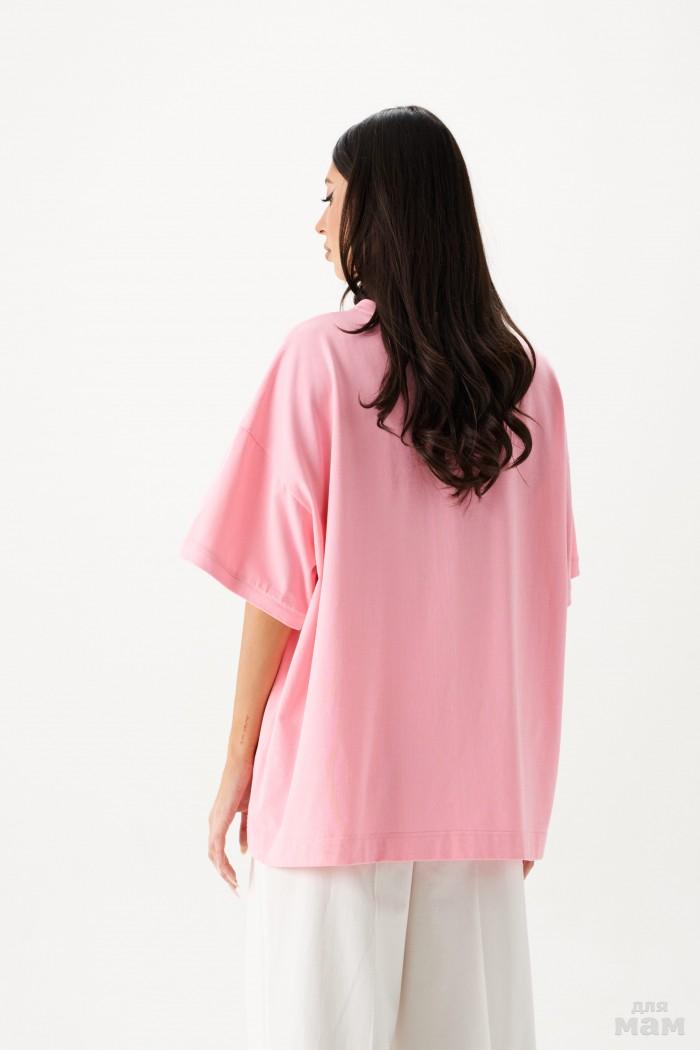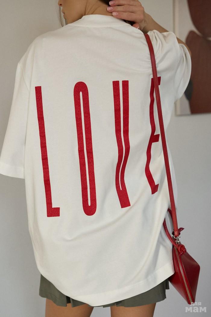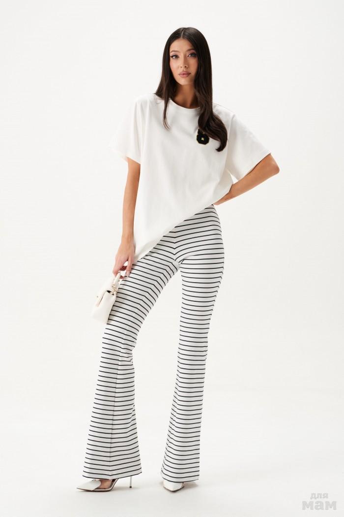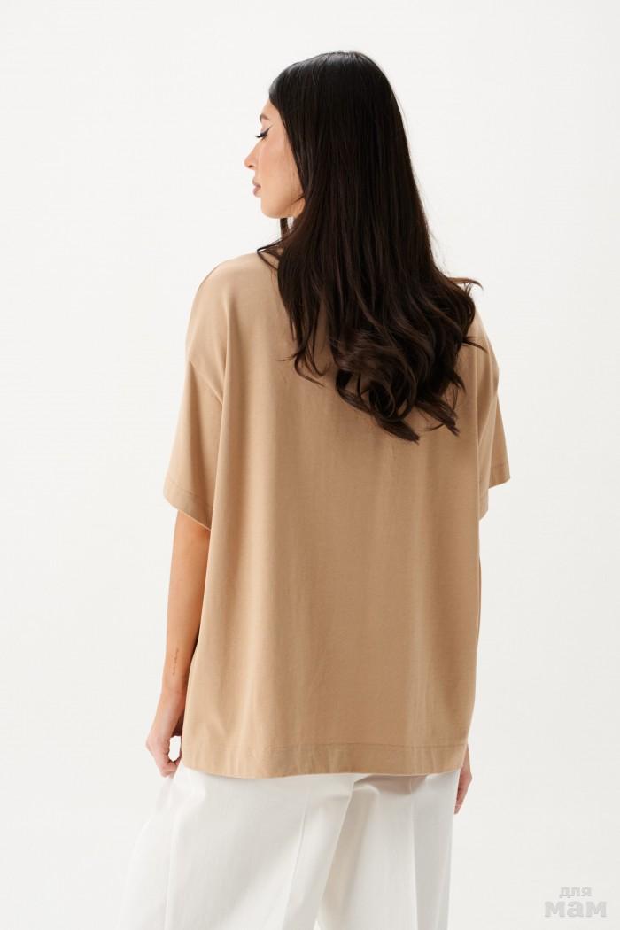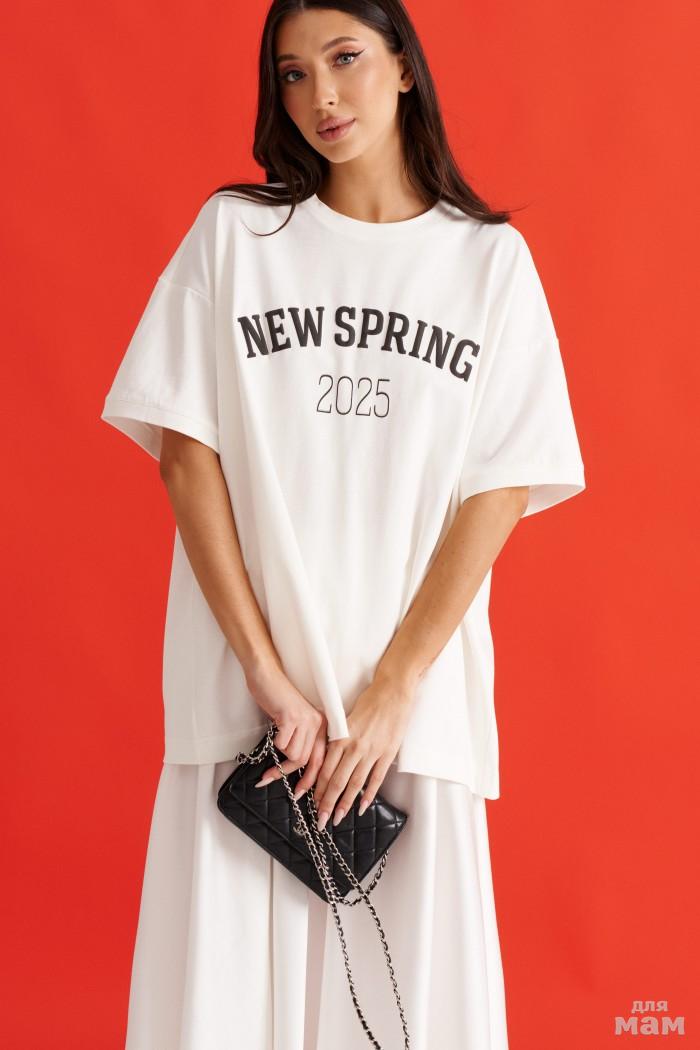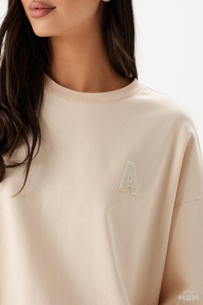 Футболка прямого свободного кроя, выполнена из хлопкового полотна тепло-белого цвета . Характеристики: прямой свободный крой, горловина овальная, рукав слегка спущен, горловина и край рукава выполнены из довяза, спереди принт черного цвета. Длина по центру спинки от края горловины 69 см, длина рукава от края горловины 39 см.