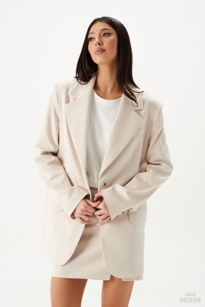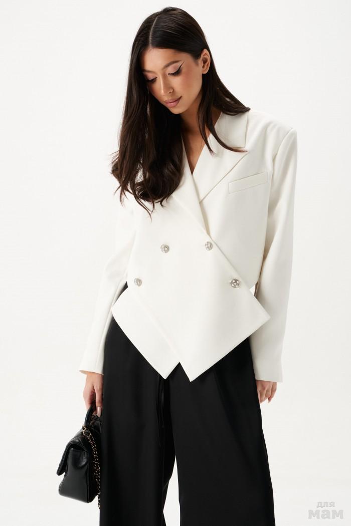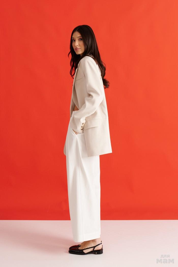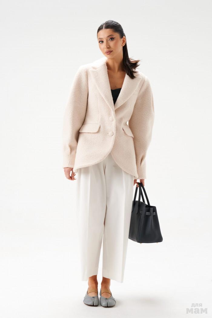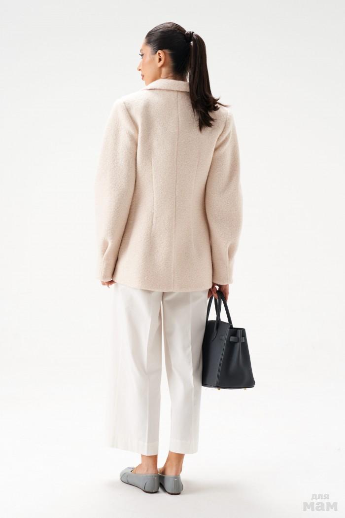 Жакет прямого свободного кроя выполнено из фактурного полотна молочного цвета.