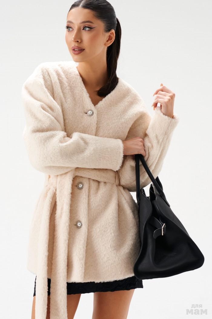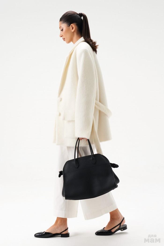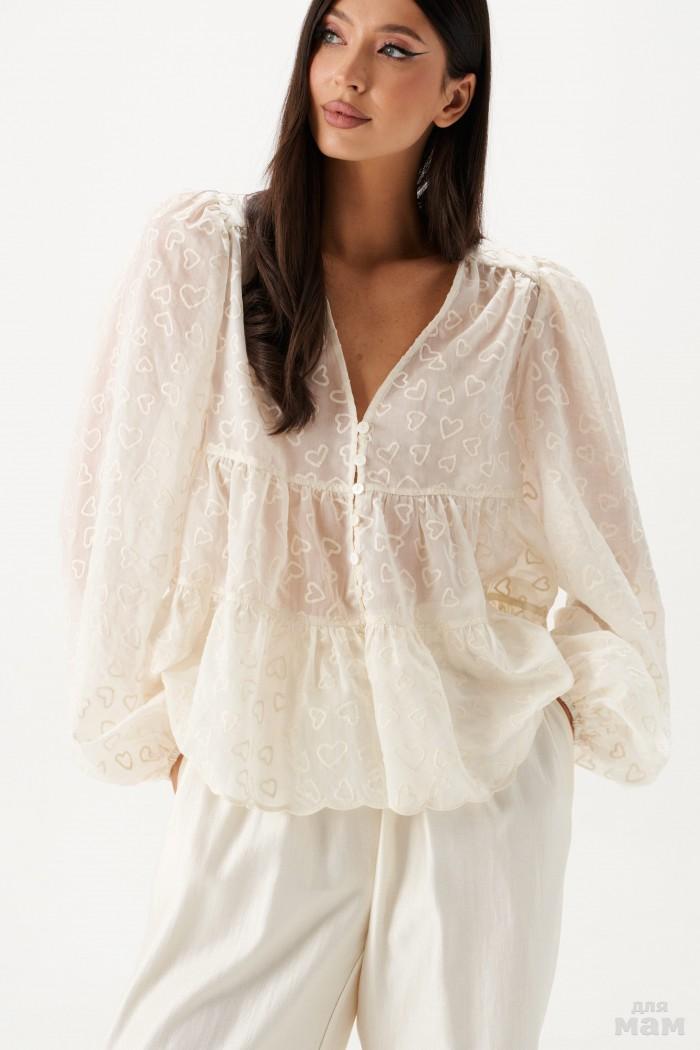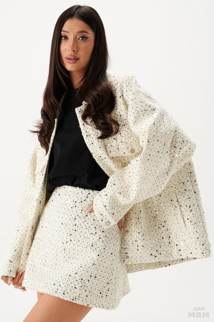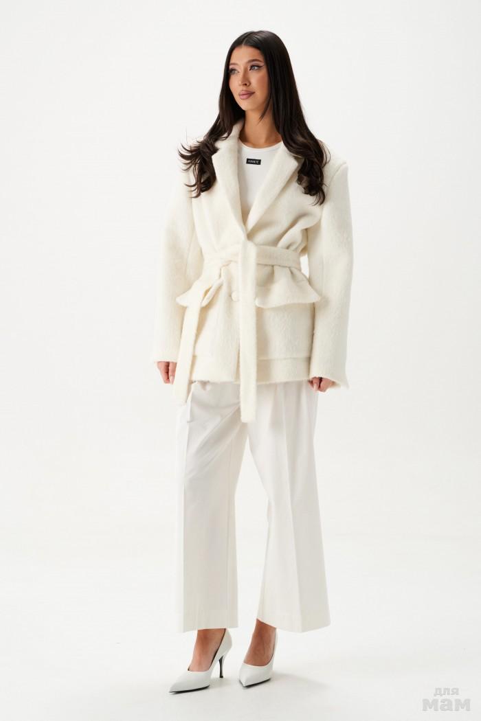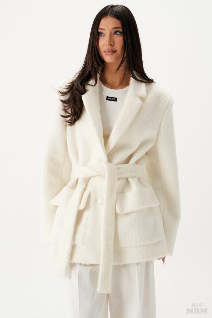 Жакет прямого свободного кроя выполнено из фактурного полотна молочного цвета.