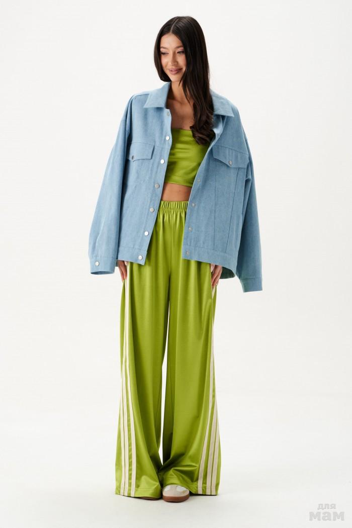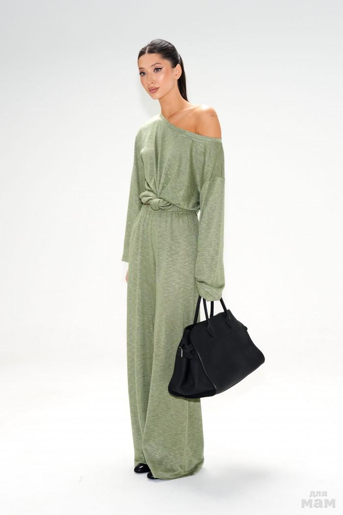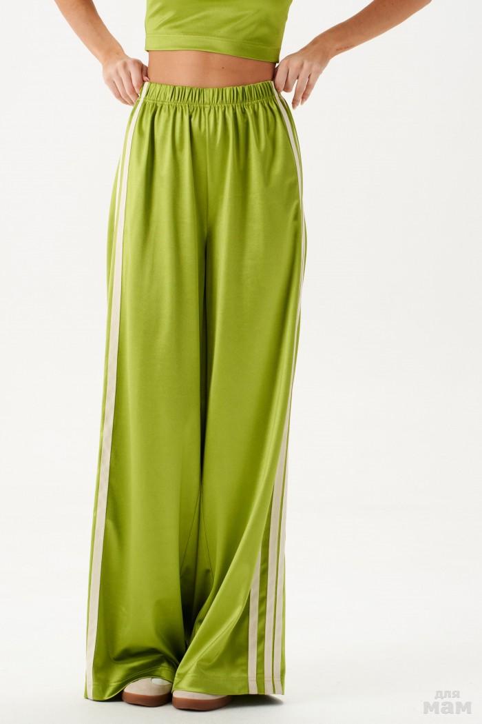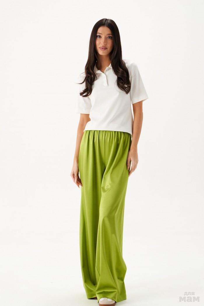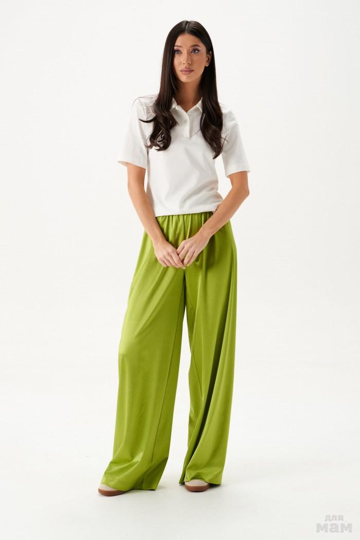 Брюки прямого свободного кроя. Выполнены из трикотажной гладкой ткани салатового цвета. Характеристики: прямой крой, пояс на резинке. Длина по боковому шву 108см