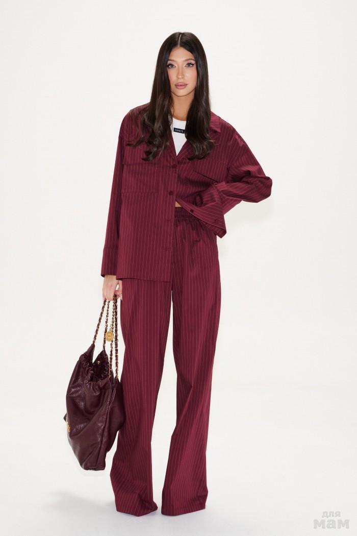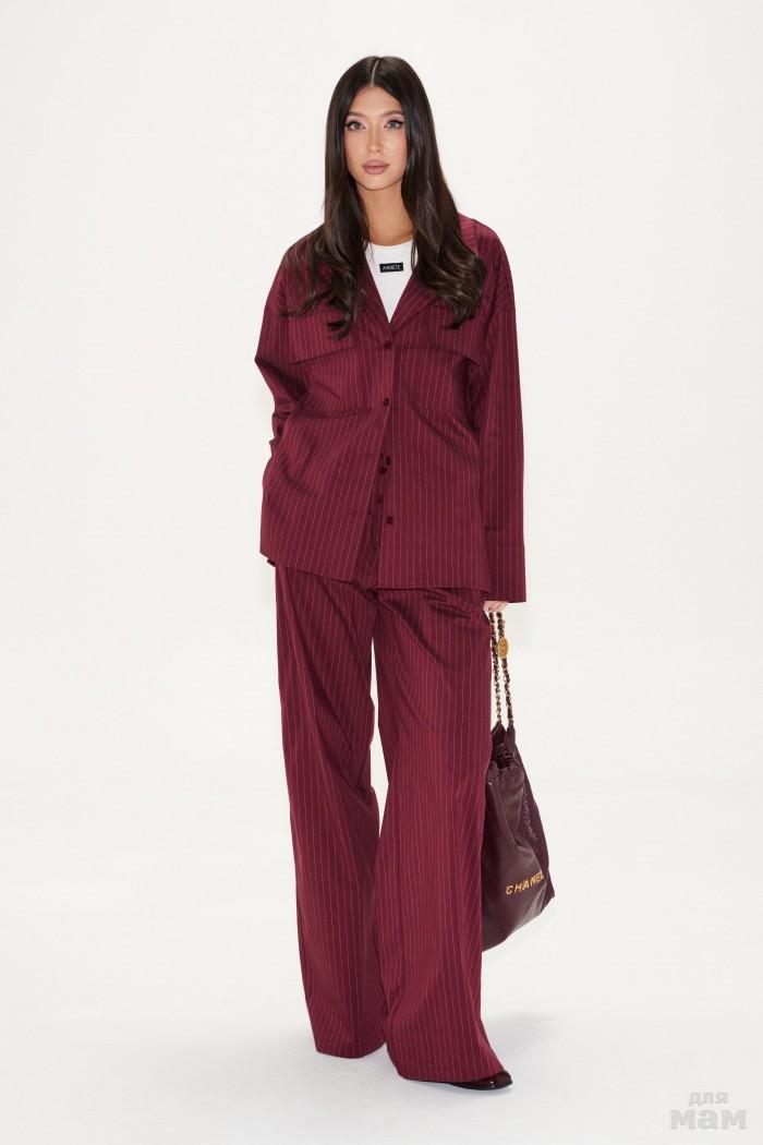 Комплект из рубашки и брюк. Выполнен из хлопкового полотна в бордовом цвете в полоску