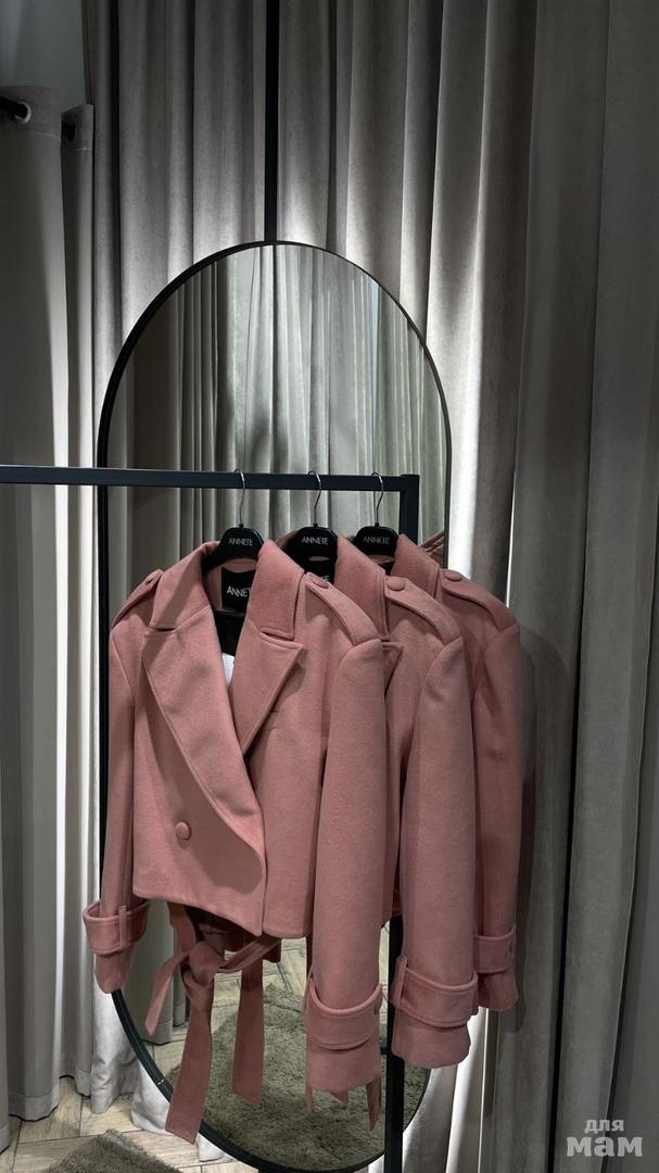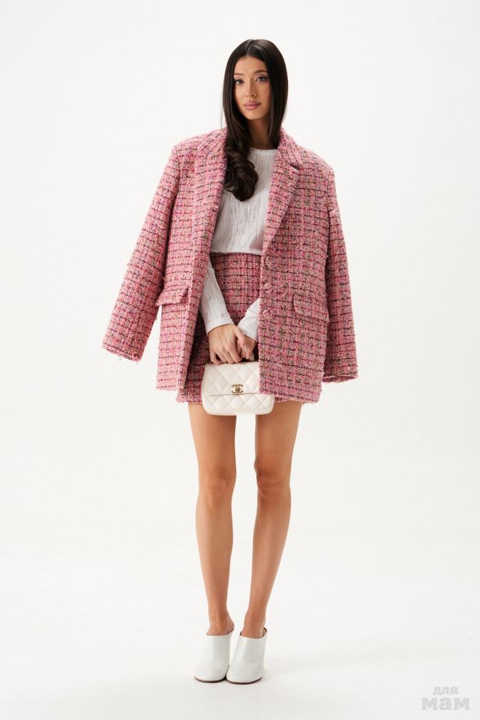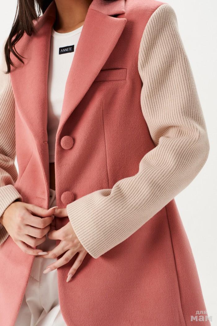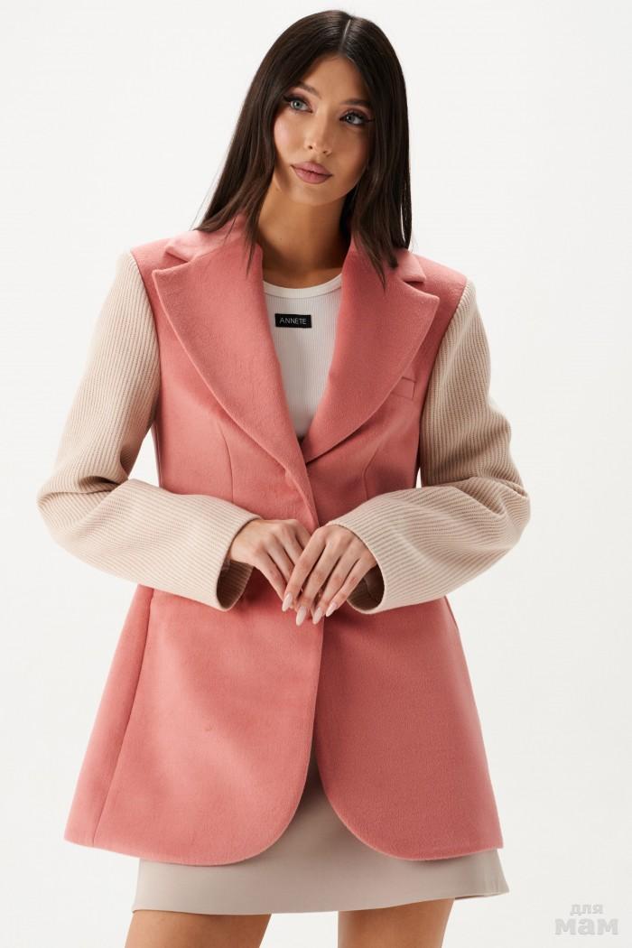 Жакет прилегающего силуэта. Выполнен из пальтовой ткани розового цвета в комбинации с пальтовой фактурной тканью бежевого цвета. Воротник отложной с лацканами. Рукав втачной. Есть подкладка. По переду вверху имитация карманы с листочкой, внизу функциональные карманы с листочкой. Застёжка центральная петли-пуговицы. Длина спинки 74 см, длина рукава 64 см
