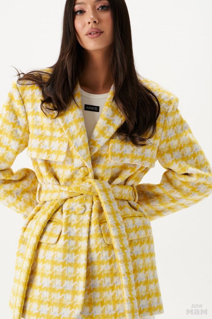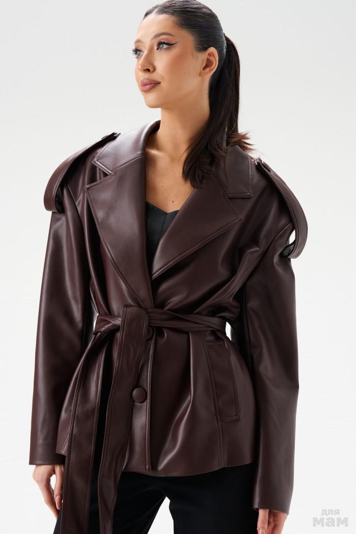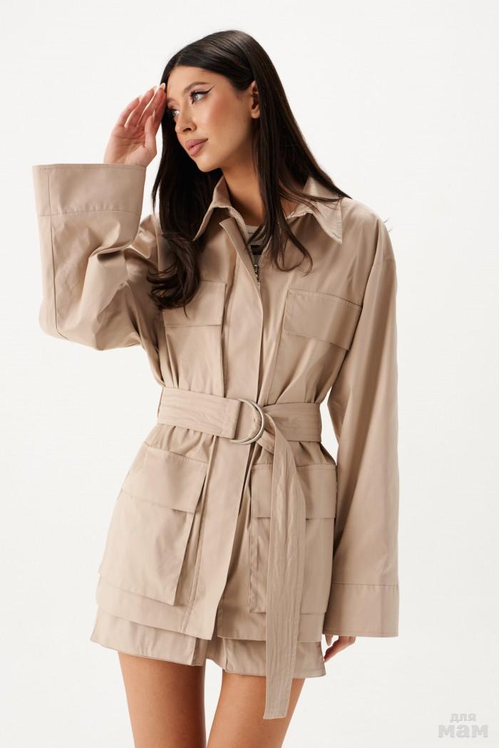 Характеристика: прямой свободный крой, подкладка, подплечники, воротник с остроугольным лацканом, застежка центральная на петлю - пуговицу, по переду функциональные карманы с клапаном, рукав втачной, по низу рукава нашиты пуговички, пояс выполнен из основной ткани изделия, в среднем шве по спинке разрез 24 см. Длина по спинке от края горловины 76см, длина рукава от края горловины 80 см.