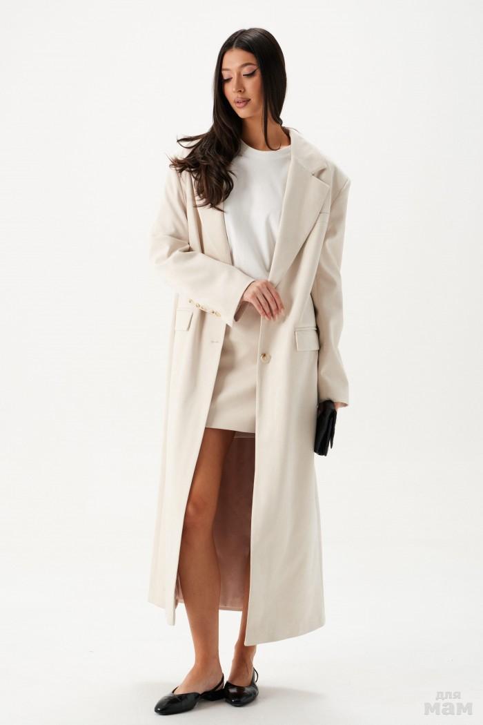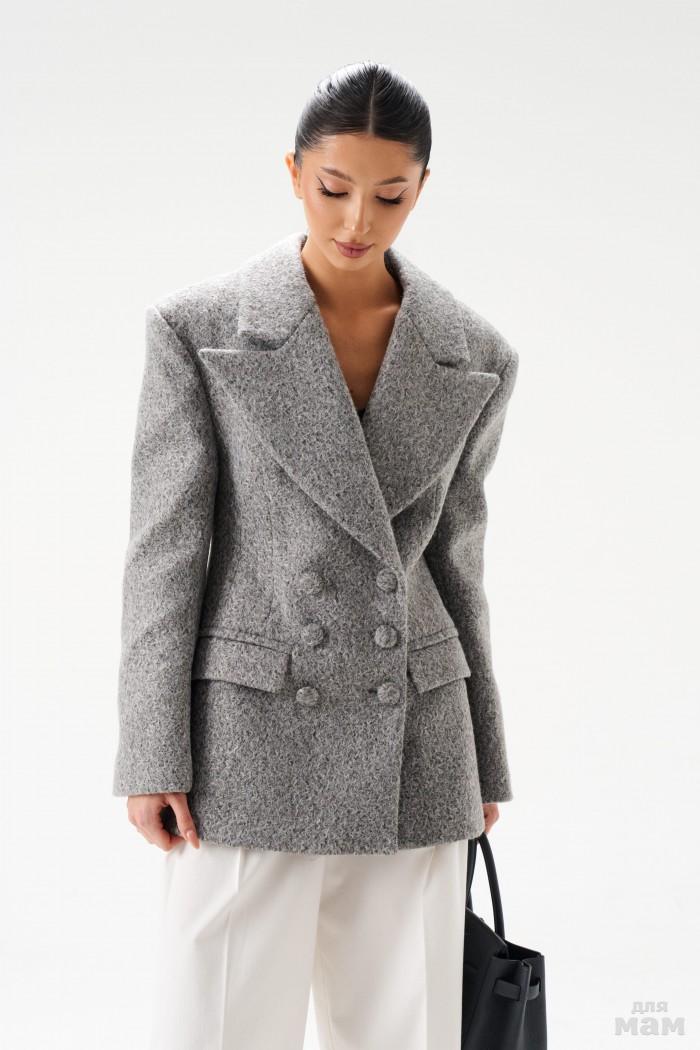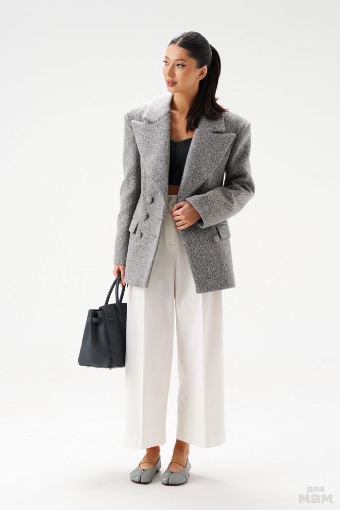 Пальто двубортное. Выполнено из пальтовой ворсовой ткани серого цвета. Есть подклад. Воротник отложной с широкими лацканами. Застежка центральная на петли пуговицы (обтянуты тканью основного изделия). Рукав втачной, немного спущен, есть подплечники, по низу рукава пата с пуговицей. Длина рукава 61 см. По линии плеча погон с пуговицей. Карман листочка с клапаном. В комплекте пояс из ткани основного изделия. По центру спинки шлица 59 см. Длина спинки 128 см.