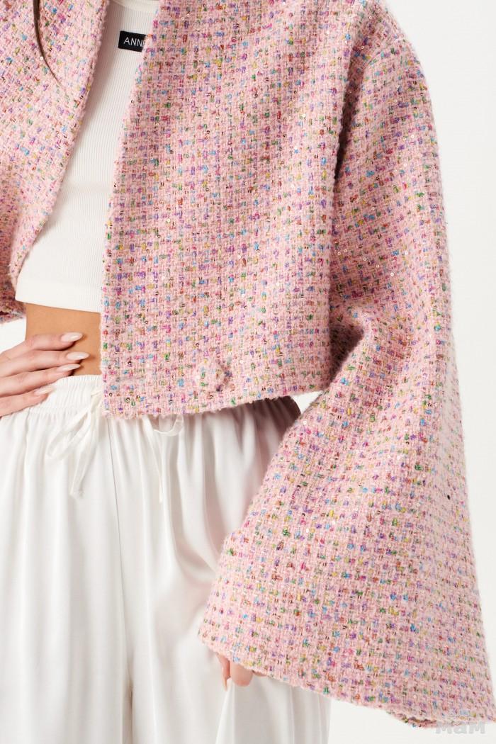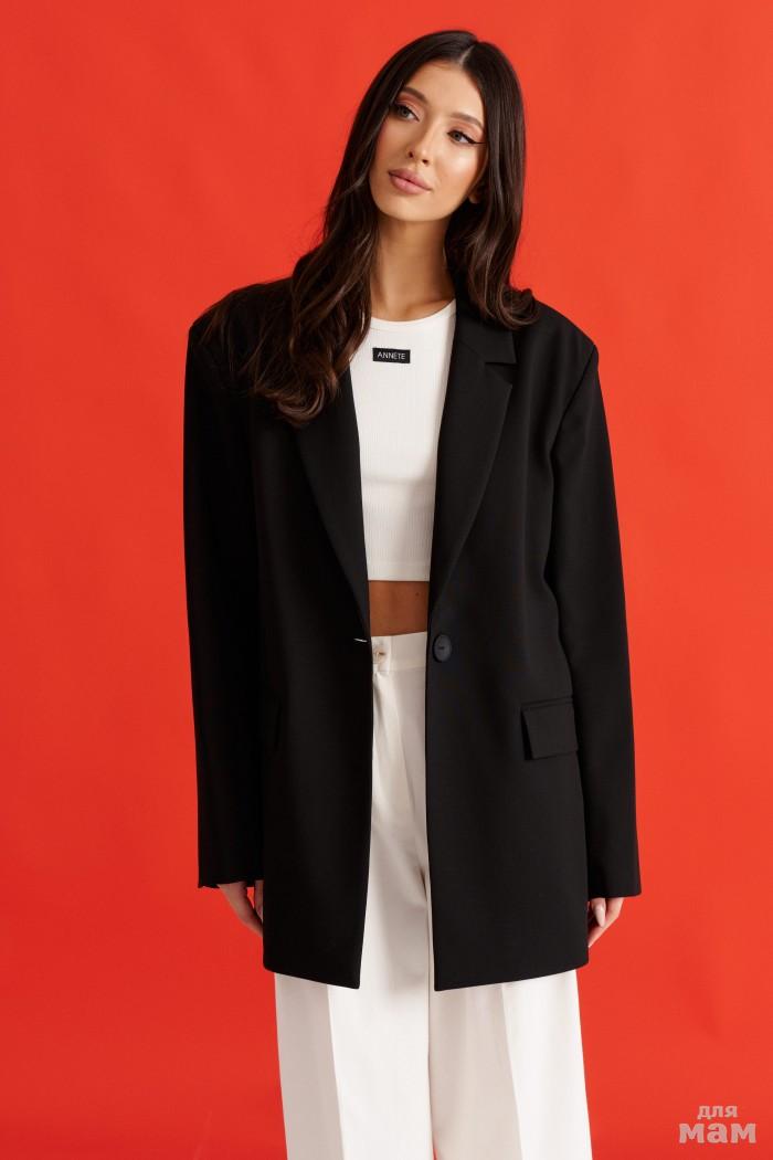 Жакет прямого свободного кроя, выполнен из ворсистой ткани серого цвета. Характеристики: горловина стойка, застежка центральнаяна петли пуговицы,рукав прямой, по плечевому шву пата на пуговице, на левом рукаве нашивка Annete. Длина по спинке 46 см, длина рукава 62 см.