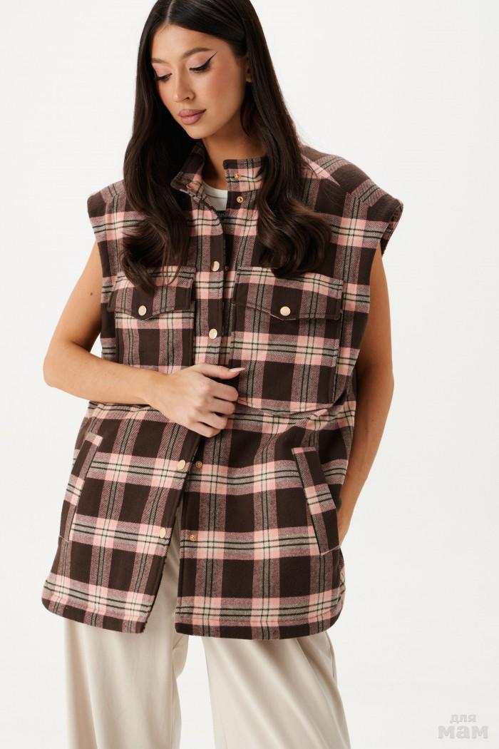 Жилет свободного кроя. Выполнен из хлопкового полотна. Воротник стойка. На уровне линии груди накладные карманы с клапаном, внизу прорезные карманы с листочкой. Линия плеча расширенная. Спинка цельнокроенная, переходящая в кокетку. Застёжка центральная - кнопки. Изделие с подкладкой с синтепоном. По низу внутри потайные карманы. Длина спинки 72 см
