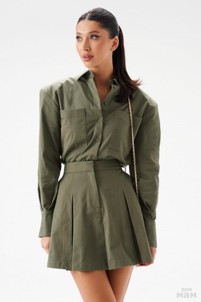 Рубашка прямого свободного кроя. Выполнена из хлопкого полотна. Воротник отложной. Застёжка центральная на пуговицы. По переду на уровни линии груди карманы с клапаном. Рукав спущенный, свободный, с манжетой на пуговице. Длина рукава от края горловины 77см. Спинка отрезная со сборкой, длин спинки от края горловины 76 см.