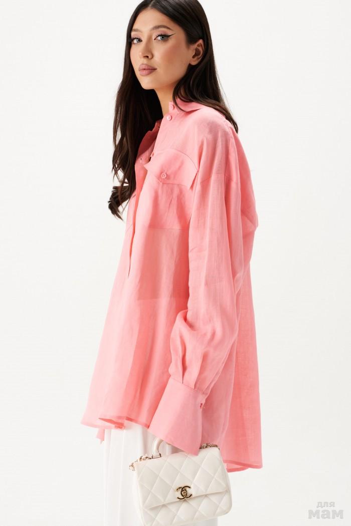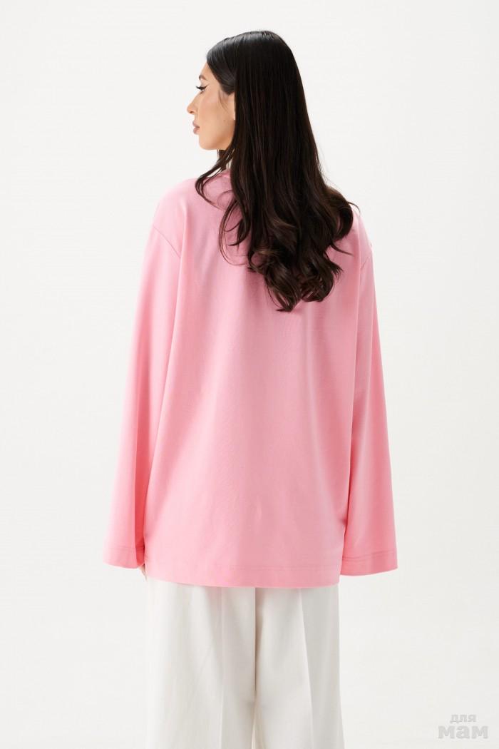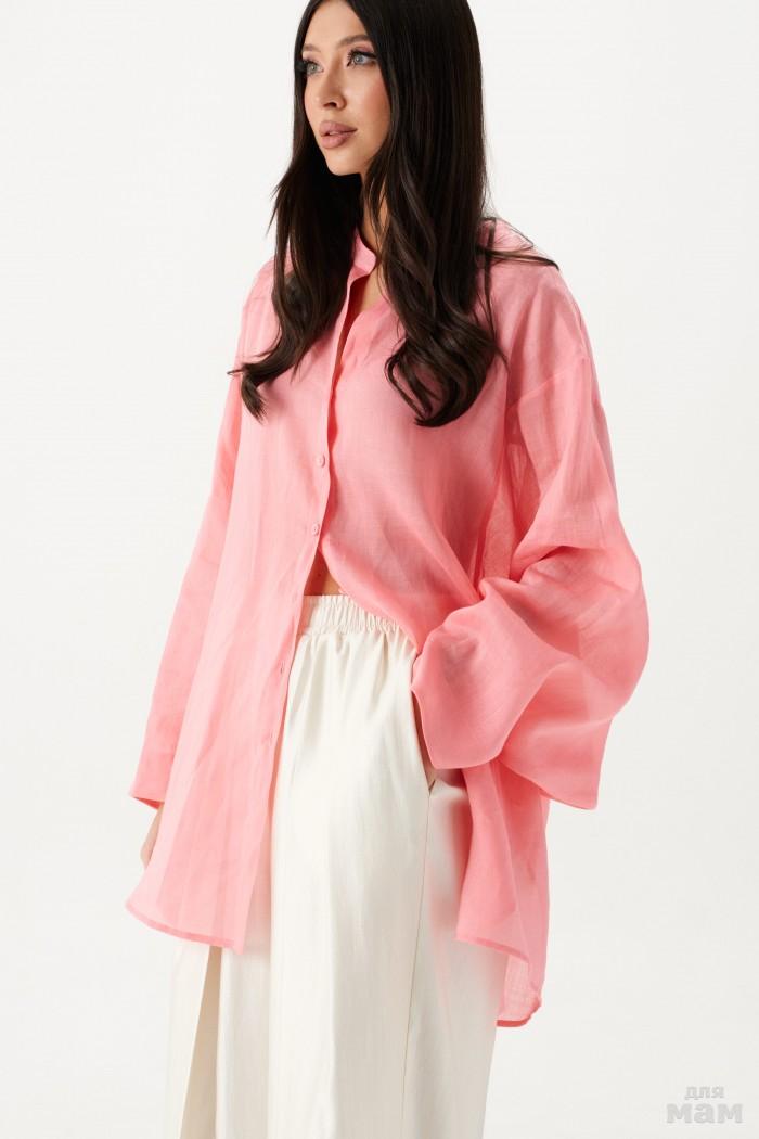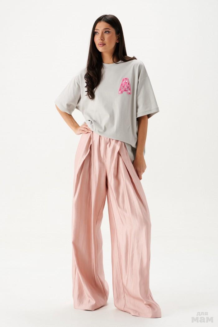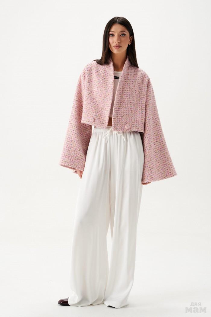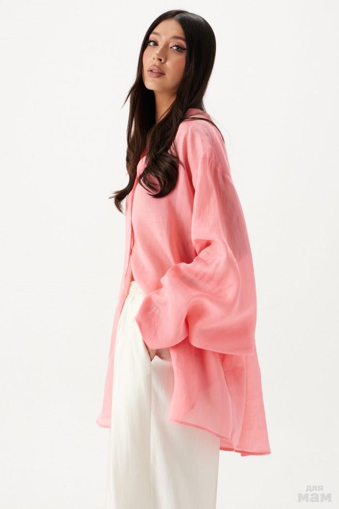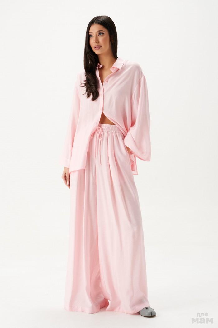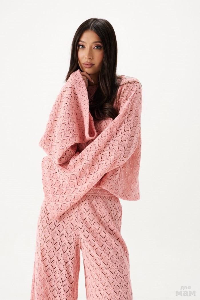Комплект состоит из джепера и брюк выполнен из полупрозрачного полотна розового цвета. Характеристики: джемпер прямого свободного кроя, овальный широкий вырез горловины, рукав спущен. Длина по спинке от края горловины 72 см, длина рукава от края горловины 75 см. Брюки прямого, свободного кроя, пояс брюк на резинке. Длина брюк по боковой линии - 110 см.