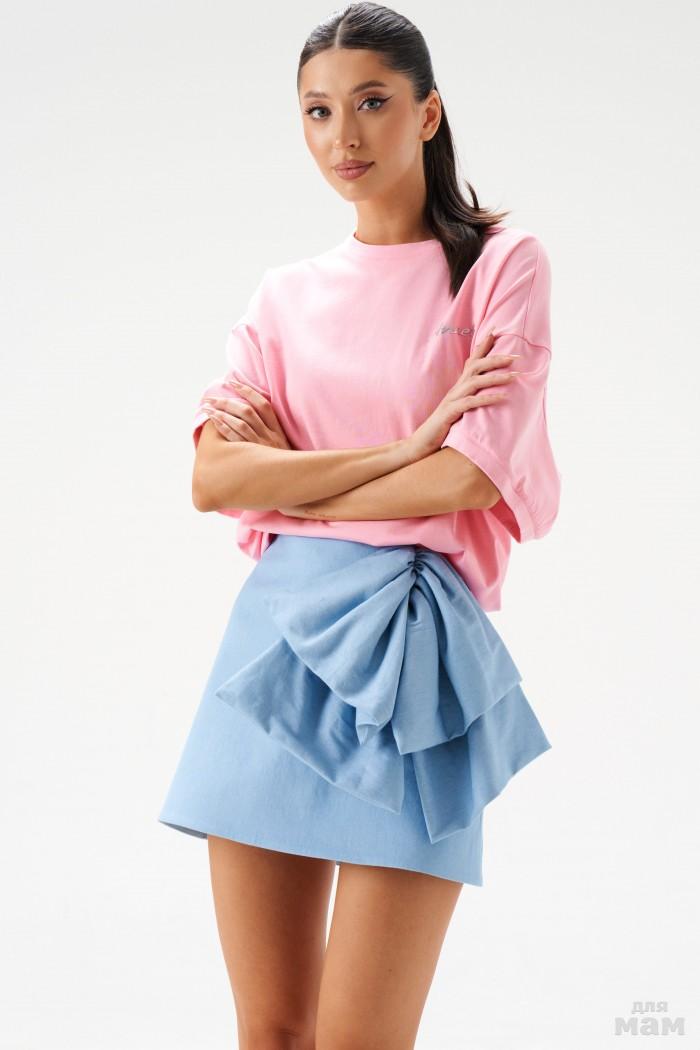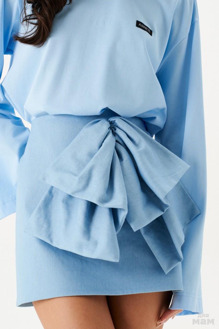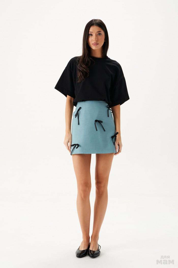 Юбка полуприлегающего силуэта выполнена текстильного полотна. Характеристики: полуприлегающий силуэт, модель расширенна к низу, на подкладке. По переду изделия нашиты бантики. В среднем шве заднего полотна юбки обработана потайная застежка молния. Пояс юбки обработан обтачкой. Длина изделия 40 см.