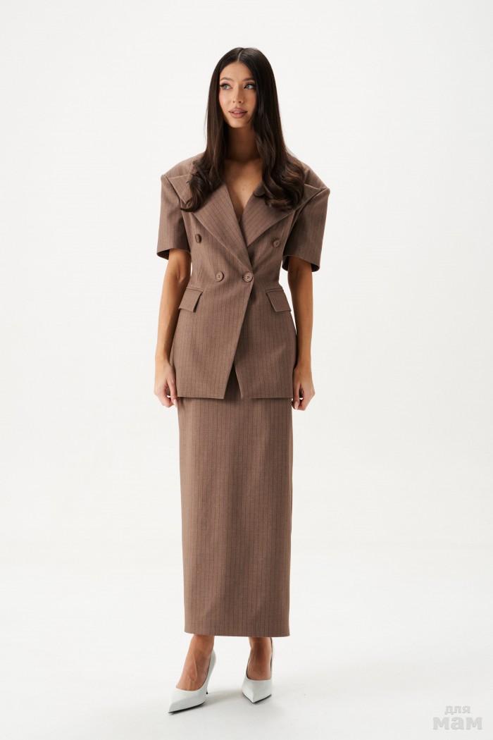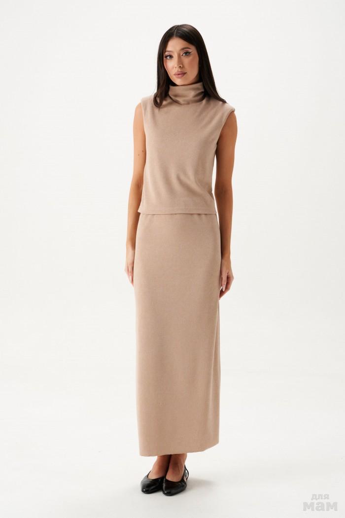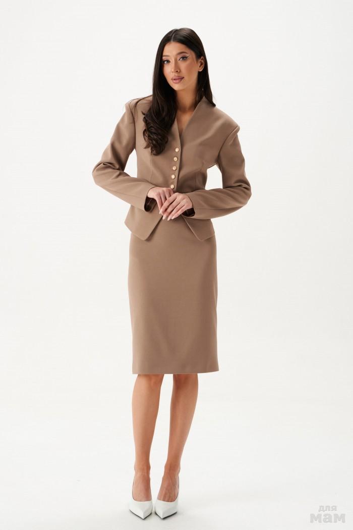 Юбка карандаш, выполнена из костюмной ткани в цвете капучино. Характеристина: полуприлагающий силуэт, подклад, пояс стабильный, на обтачке. По передней части изделия выточки. В среднем шве задней части изделия разрез 25 см. Застёжка потайная тесьма молния в среднем шве задней части изделия. Длина юбки по боковому шву 65 см.