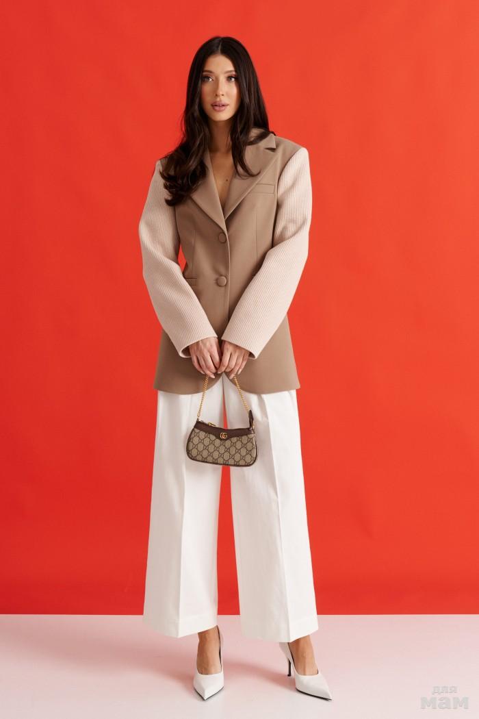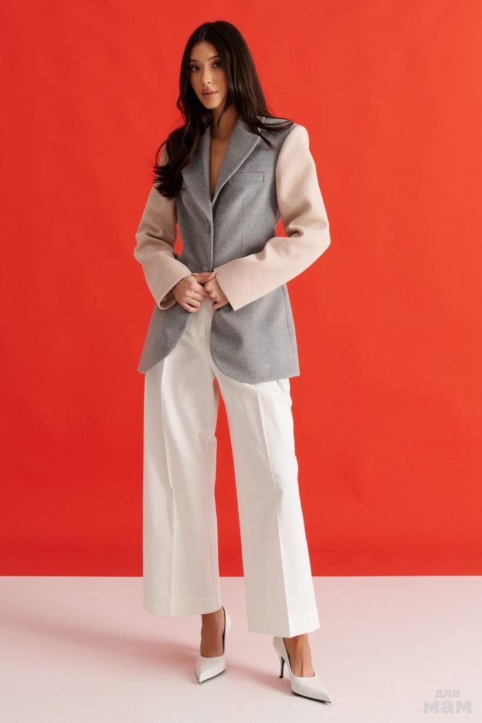 Жакет прилегающего силуэта. Выполнен из пальтовой ткани серого цвета в комбинации с пальтовой фактурной тканью бежевого цвета. Воротник отложной с лацканами. Рукав втачной. Есть подкладка. По переду вверху имитация карманы с листочкой, внизу функциональные карманы с листочкой. Застёжка центральная петли-пуговицы. Длина спинки 74 см, длина рукава 64 см