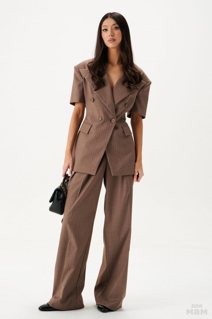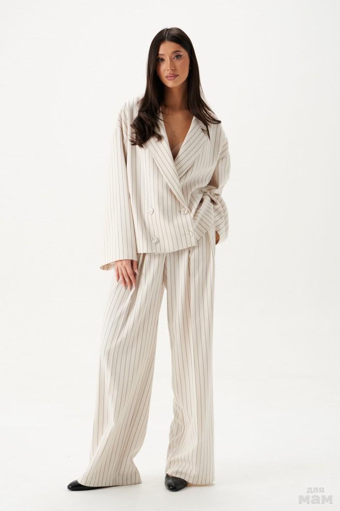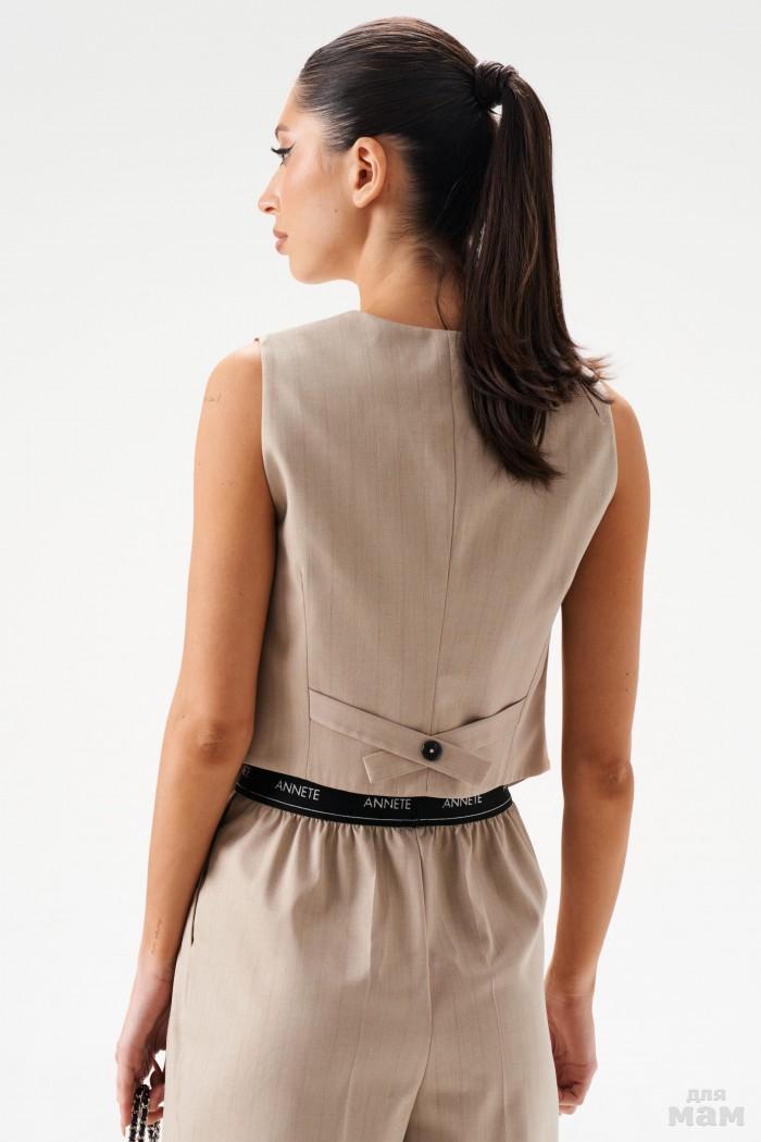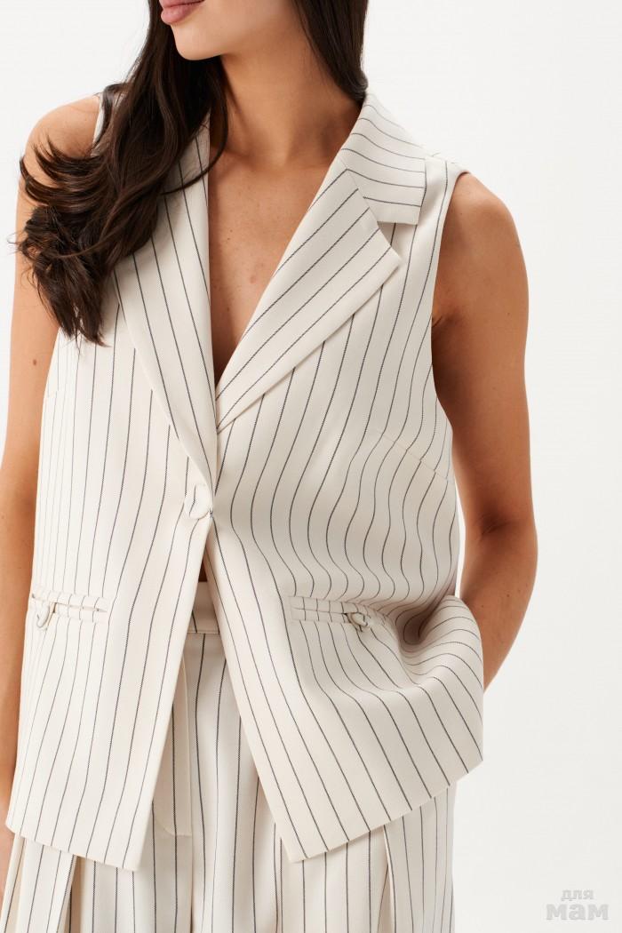 Комплект состоит из жилета и брюк, выполнен из полотна серо-голубого цвета с принтом в светлую вертикальную полоску. Брюки прямого свободного кроя, стабильный пояс на пуговице, в боковых швах карманы. По поясу нашиты шлевки, декоративная сборка по передней части, заутюженные стрелки по передней и задней части брюк. Длина брюк 113 см. Жилет прямого свободного кроя, однобортный с подкладкой, прорезные карманы обманки, застежка центральная на петли - пуговицы, низ изделия по переду с фигурным низом. Длина по спинке 46 см.