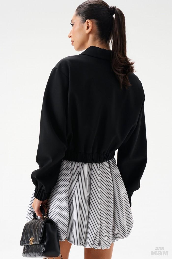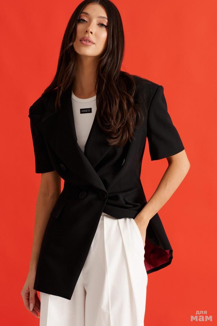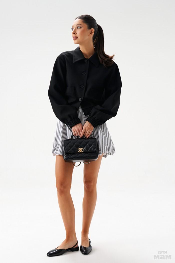Стильный укороченный жакет выполнен из черной ткани. Укороченный жакет - модный и стильный элемент в гардеробе, который придаст индивидуальность Вашим повседневным образам. Характеристики: укороченный, подкладка, отложной воротник, застежка центральная на пуговички, рукав втачной, по переду прорезные кармашки, низ рукава и низ изделия эластичные на резинке. Длина по спинке от края горловины 48см, длина рукава от края горловины 78см.